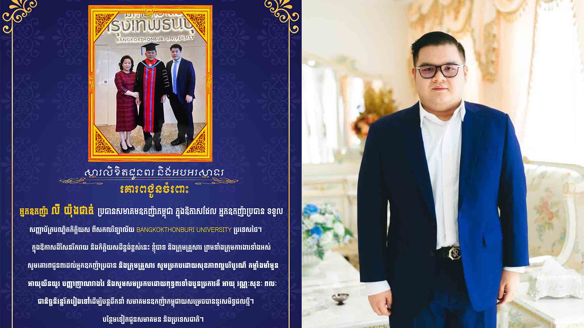 ឧកញ៉ា ឈាង សុវណ្ណរតនៈ អគ្គនាយកប្រតិបត្តិ ក្រុមហ៊ុន អ ធី អិន ខេ អុិនវេសមុិន ឯ.ក ព្រមទាំងគណៈគ្រប់គ្រង និងបុគ្គលិកទាំងអស់ ផ្ញើសារលិខិតជូនពរ និងអបអរសាទរជូនចំពោះ អ្នកឧកញ៉ា លី យ៉ុងផាត់ ប្រធានសមាគមឧកញ៉ាកម្ពុជា ក្នុងឱកាសដែល អ្នកឧកញ៉ាប្រធាន ទទួលសញ្ញាបត្របណ្ឌិតកិត្តិយស ពីសកលវិទ្យាល័យ BANGKOKTHONBURI UNIVERSITY ប្រទេសថៃ។
