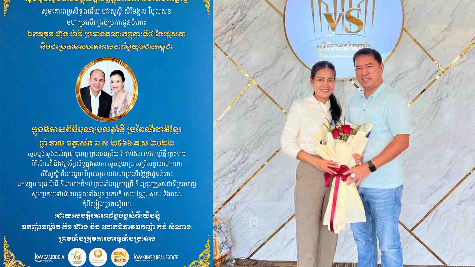ម្ចាស់បុរី វិមានសំណាង ឧកញ៉ាបណ្ឌិត គីម ហ៊ាង និងលោកជំទាវឧកញ៉ា គង់ សំណាង សូមគោរពជូនពរ ឯកឧត្ដម ហ៊ុន ម៉ានី ប្រធានគណៈកម្មការទី៧ នៃរដ្ឋសភា និងជាប្រធានសហភាពសហព័ន្ធយុវជនកម្ពុជា ព្រមទាំងលោកជំទាវ យឹម ឆៃលីន និងក្រុមគ្រួសារ ក្នុងឱកាសពិធីបុណ្យចូលឆ្នាំថ្មី ប្រពៃណីជាតិខ្មែរ ឆ្នាំខាល ចត្វាស័ក ព.ស ២៥៦៦ គ.ស ២០២២ ។