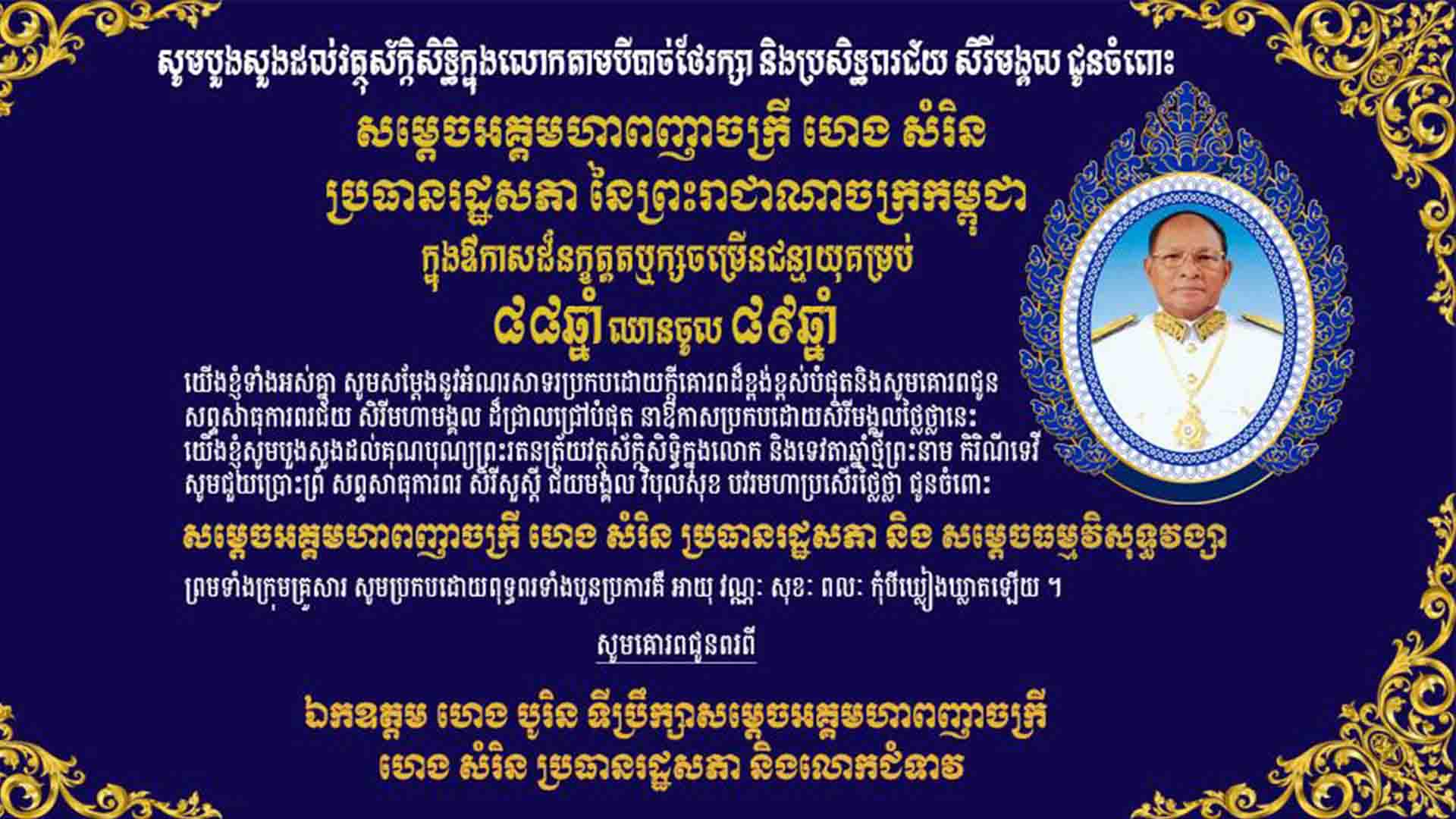 ឧកញ៉ា ហេង បូរិន ទីប្រឹក្សាសម្ដេចអគ្គមហាពញាចក្រី ហេង សំរិន និងលោកជំទាវ បានផ្ញើសារលិខិតគោរពជូនពរ សម្ដេចអគ្គមហាពញាចក្រី ហេង សំរិន ប្រធានរដ្ឋសភា នៃកម្ពុជា នាឱកាសដ៏មហាជ័យមង្គលចម្រើនជន្មាយុ គម្រប់ ៨៨ឆ្នាំ ឈានចូល ៨៩ឆ្នាំ ដែលប្រព្រឹត្តទៅនៅថ្ងៃពុធ ១០រោច ខែពិសាខ ឆ្នាំខាល ចត្វាស័ក ព.ស.២៥៦៦ ត្រូវនឹងថ្ងៃទី២៥ ខែឧសភា ឆ្នាំ២០២២។