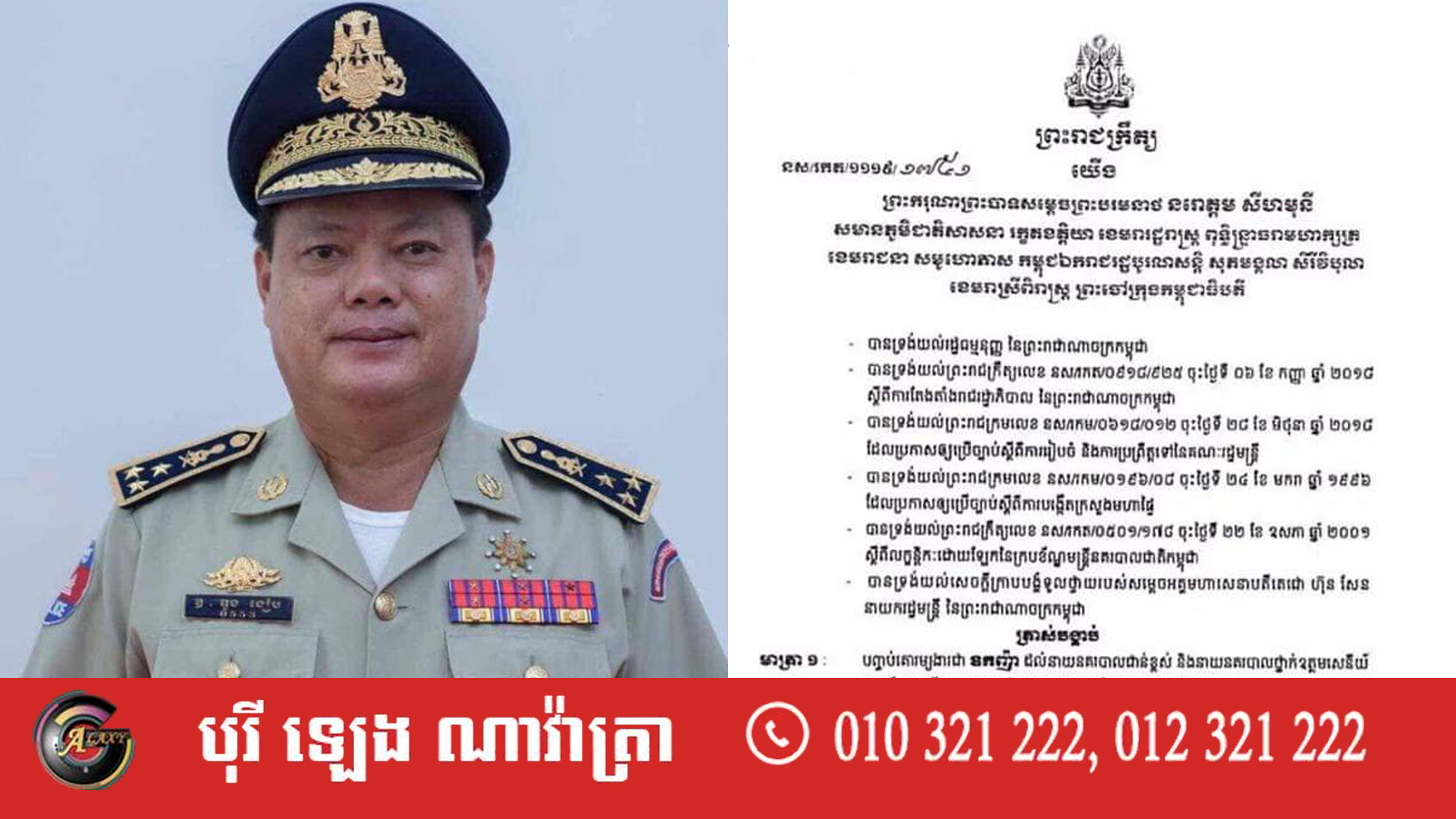 ព្រះករុណា ព្រះបាទសម្តេចព្រះបរមនាថ នរោត្តម សីហមុនី ព្រះមហាក្សត្រនៃព្រះរាជាណាចក្រកម្ពុជា បានសម្រេចចេញព្រះរាជក្រឹត្យបញ្ចប់គោរម្យងារជា «ឧកញ៉ា» ដល់នាយនគរបាលជាន់ខ្ពស់ និងនាយនគរបាលថ្នាក់ឧត្តមសេនីយ៍ ក្របខ័ណ្ឌមន្ត្រីនគរបាលជាតិកម្ពុជា នៃក្រសួងមហាផ្ទៃ ចំនួន ៣៦រូប។ នេះបើតាមព្រះរាជក្រឹត្យ ចុះថ្ងៃទី ២៣ ខែវិច្ឆិកា ឆ្នាំ២០១៩។
