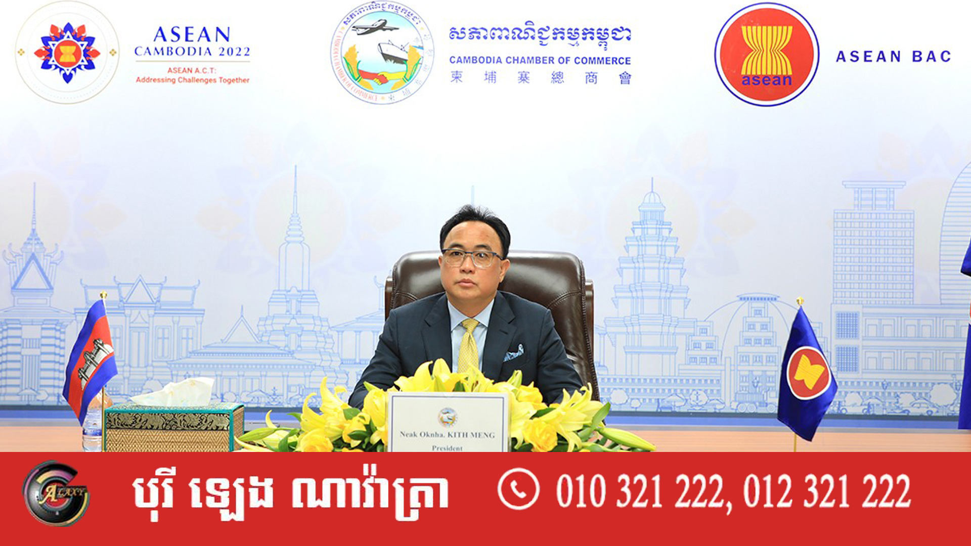 នាព្រឹកថ្ងៃអង្គារ ទី១៩ ខែកក្កដា ឆ្នាំ២០២២ អ្នកឧកញ៉ា គិត ម៉េង ប្រធានសភាពាណិជ្ជកម្មកម្ពុជា និងជាប្រធានក្រុមប្រឹក្សាពិគ្រោះយោបល់ធុរកិច្ចអាស៊ាន បានចូលរួមថ្លែងសុន្ទរកថា និងធ្វើបទអន្តរាគមន៍ ក្នុងអំឡុងពេលកិច្ចសន្ទនាឆ្លងវិស័យ សម្រាប់ផែនការអនុវត្តសេដ្ឋកិច្ចចក្រា (Circular Economy) តាមប្រព័ន្ធអនឡាញ។