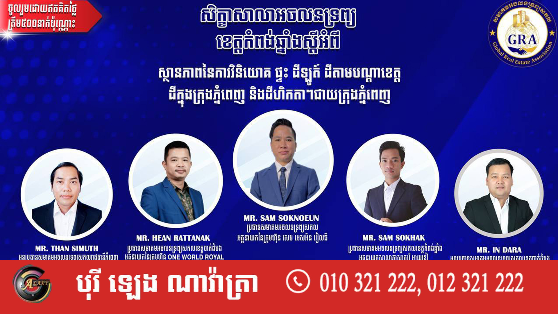 កម្មវិធីសិក្ខាសាលាខាងលើនេះ រៀបចំដោយសមាគមអចលនទ្រព្យសកល (GRA) ដែលចាប់ផ្តើមចាប់ពីម៉ោង ៨:៣០ព្រឹក ដល់ម៉ោង ១៦:០០ល្ងាច នៅសណ្ឋាគារ សុខថៃសាន ក្រុងកំពង់ឆ្នាំង។ ទីតាំងសិក្ខាសាលាលេី Google Map ឬអាចទំនាក់ទំនងចុះឈ្មោះតាមរយៈលេខទូរស័ព្ទ ៖ ០៦១ ៥៨៧ ៧២៣ / ០៩៣ ៣១០ ៧៣៧ ៕