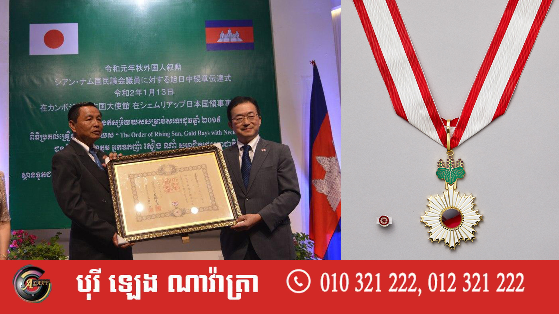 អ្នកឧកញ៉ា សៀង ណាំ សមាជិករដ្ឋសភា និងជាតំណាងរាស្ត្រមណ្ឌលខេត្តសៀមរាប បានទទួលគ្រឿងឥស្សរិយយស លំដាប់ព្រះអាទិត្យ (The Order of the Rising Sun. Gold Rays With Neck Ribbon) ប្រទានដោយព្រះចៅអធិរាជជប៉ុន និងបានរៀបចំពិធីប្រគល់ទទួល នៅក្រុងសៀមរាប កាលពីថ្ងៃទី១៣ ខែមករា ឆ្នាំ២០២០។