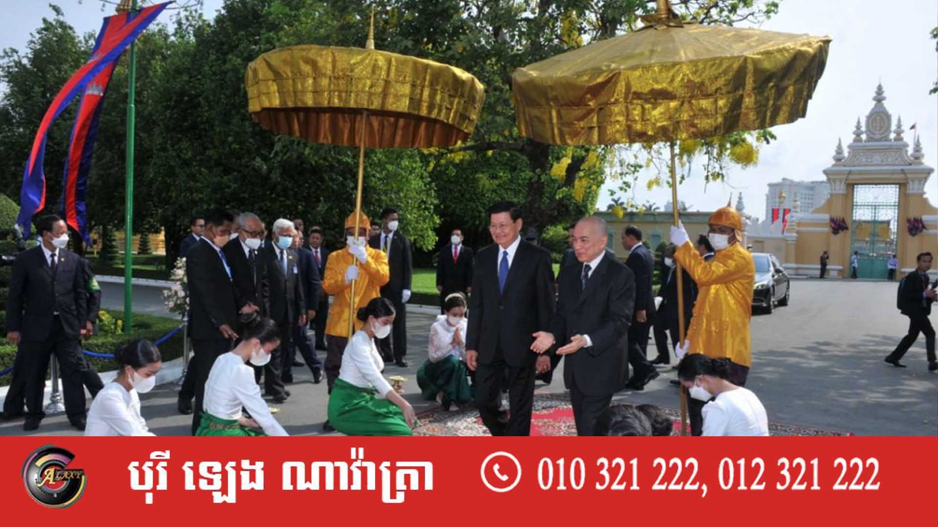 ព្រះករុណា ព្រះបាទសម្តេចព្រះបរមនាថ នរោត្តម សីហមុនី ព្រះមហាក្សត្រនៃកម្ពុជា យាងថ្វាយព្រះរាជបដិសណ្ឋារកិច្ចផ្លូវការជូនលោក ថងលុន ស៊ីសុលីត (Thongloun Sisoulith) ប្រធានរដ្ឋឡាវ នៅព្រះបរមរាជវាំង នាព្រឹកថ្ងៃទី០៤ ខែឧសភា ឆ្នាំ២០២៣ ក្នុងឱកាសនៃដំណើរទស្សនកិច្ចផ្លូវរដ្ឋរបស់លោកនៅកម្ពុជា។