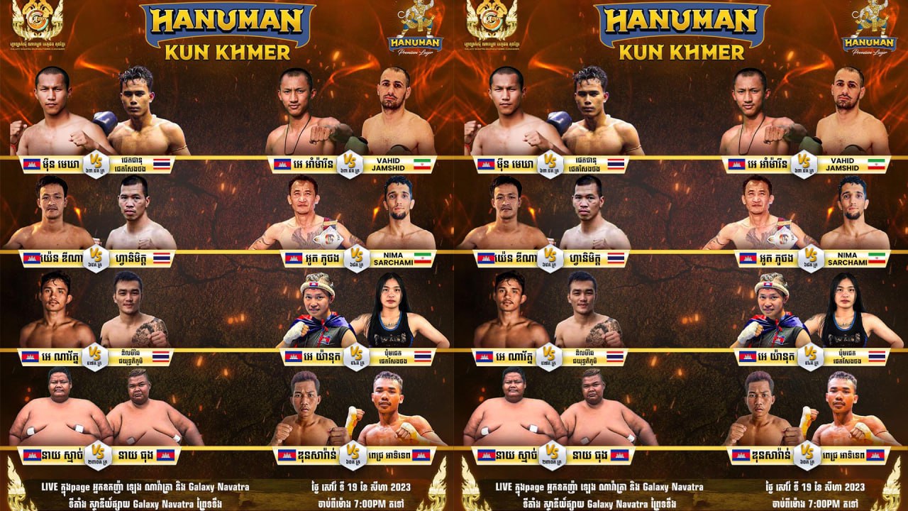 មហាព្រឹត្តិការណ៍ប្រកួតប្រដាល់ Hanuman Kun Khmer នឹងឡើងរេញវៃគ្នាសម្រាប់សប្តាហ៍នេះនៅថ្ងៃសៅរ៍ទី១៩ ខែសីហានេះ មានចំនួន ៨គូ ដូចជា កីឡាករវ័យក្មេងពូជពង្សស្តេចប្រដាល់ ម៉ឺន មេឃា ប្រកួតជាមួយកីឡារមកពីថៃ ផេតផានុ ផេតសែងផង, កីឡាករ អេ អាំម៉ារីន ប្រកួតជាមួយកីឡាករ Vadhid Jamshid មកពីប្រទេសអ៉ឺរ៉ង់, កីឡាករ យ៉េន ឌីណា ប្រកួតជាមួយកីឡារ ហ្វានិមិត្ត មកពីប្រទេសថៃ, កីឡាករ អូត ភូថង ប្រកួតជាមួយកីឡាករមកប្រទេសអ៉ឺរ៉ង់ Nima Sarchami, កីឡាករ អេ ណារ័ត្ន ប្រកួតជាមួយកីឡាករ ដេនមីឆៃ ផយុទ្ធភូមិ ពីមកប្រទេសថៃ, កីឡាការិនី អេ យ៉ានុតភូថង ប្រកួតជាមួយកីឡាការិនី ប៉ុមផេត ផេតសែងថង មកពីប្រទេសថៃ, កីឡាករ ឌុនសារ៉ាន់ ប្រកួតជាមួយ កីឡាករ ពេជ្រ អាទិទេព និងមានការចូលពីនាយ ស្មាច់ ប៉ះជាមួយនាយ ធុង នឹងផ្អើសសង្វៀនប្រដាល់ Hanuman Kun Khmer ហើយ។
