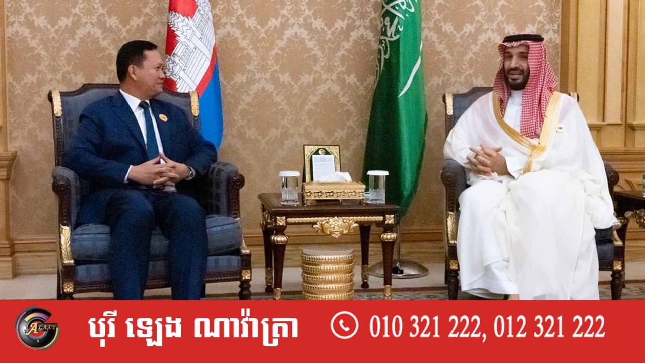 ក្រៅកិច្ចប្រជុំកំពូលអាស៊ាន-ក្រុមប្រឹក្សាសហប្រតិបត្តិការឈូងសមុទ្រ នៅទីក្រុងរីយ៉ាដ សម្តេចមហាបវរធិបតី ហ៊ុន ម៉ាណែត នាយករដ្ឋមន្រ្តី ជួបពិភាក្សាការងារជាមួយព្រះអង្គម្ចាស់ Mohammed Bin Salman Bin Abdulaziz Al Saud រជ្ជទាយាទ និងជានាយករដ្ឋមន្ត្រីអារ៉ាប៊ីសាអូឌីត កាលថ្ងៃទី២០ ខែតុលា ឆ្នាំ២០២៣។