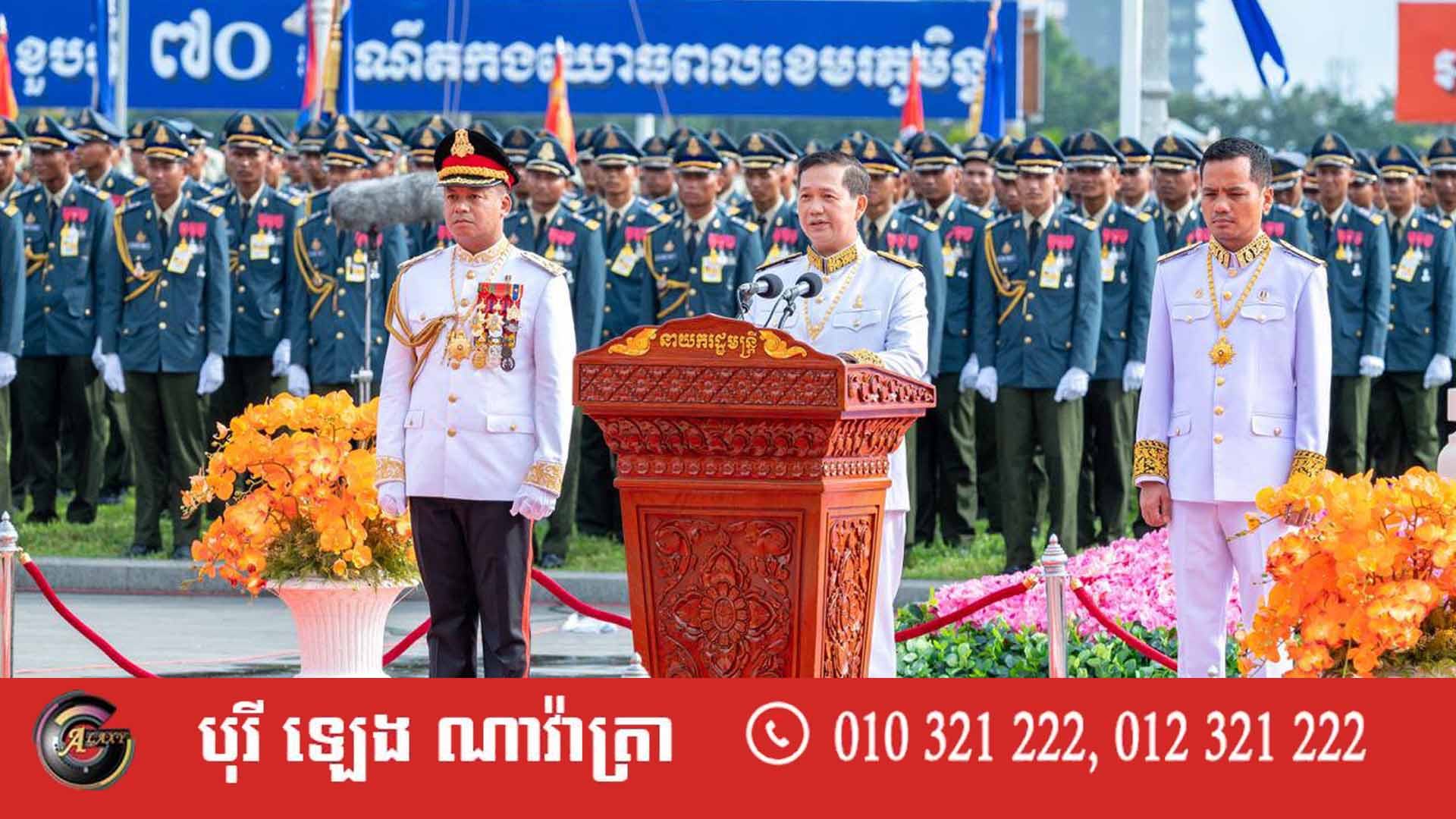 នៅចំពោះព្រះភ័ក្ដ្រ ព្រះមហាក្សត្រ សម្ដេចមហាបវរធិបតី ហ៊ុន ម៉ាណែត នាយករដ្ឋមន្ដ្រីនៃកម្ពុជា បានប្រកាសថាក្នុងខួបអនុស្សាវរីយ៍លើកទី៧០ ទិវាកំណើតកងយោធពលខេមរភូមិន្ទ, នាយទាហាន និងពលទាហានគ្រប់រូប នៃកងយោធពលខេមរភូមិន្ទ នឹងបន្តប្តូរផ្តាច់ឥតងាករេ ក្នុងការធ្វើពលិកម្មបូជាសាច់ស្រស់, ឈាមស្រស់ ដើម្បីការពារទឹកដី ការពារអង្គព្រះមហាក្សត្រ ការពាររដ្ឋធម្មនុញ្ញ, ការពាររាជរដ្ឋាភិបាល ដែលប្រសូត្រចេញពីការបោះឆ្នោត ផ្អែកតាមរដ្ឋធម្មនុញ្ញ និងលទ្ធិប្រជាធិបតេយ្យសេរីពហុបក្ស។