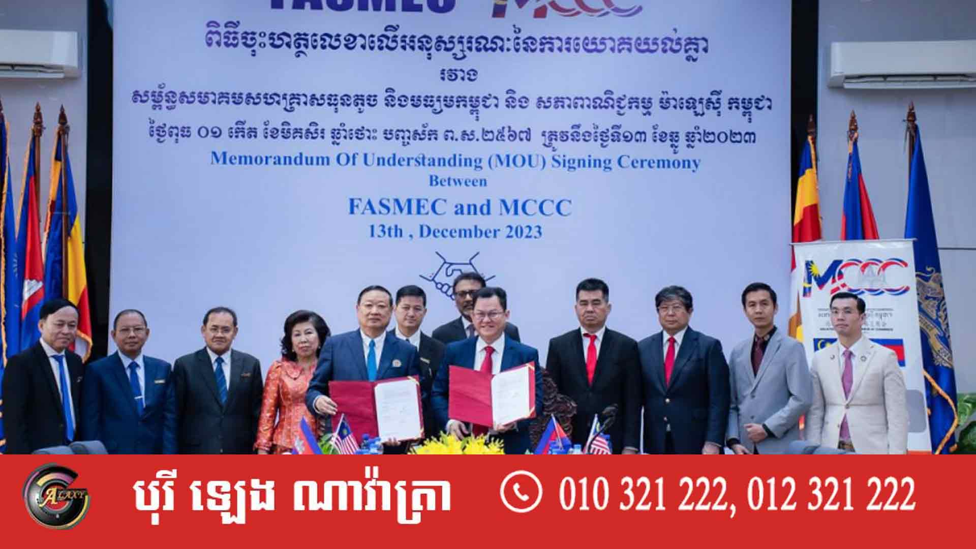 ពិធីចុះ MOU ធ្វើឡើងក្រោមវត្តមានឧកញ៉ា តែ តាំងប៉ ប្រធានក្រុមប្រឹក្សាភិបាល សម្ព័ន្ធសមាគមសហគ្រាសធុនតូច និងមធ្យមកម្ពុជា (FASMEC) និងឧកញ៉ា រីគី យ៉ាវ ចាន់ ឆយ (Dato’s Sri Dr Ricky Yaw Chan Choy) ប្រធានក្រុមប្រឹក្សាភិបាលសភាពាណិជ្ជកម្មម៉ាឡេស៊ីកម្ពុជា (MCCC) នៅថ្ងៃទី១៣ ខែធ្នូ ឆ្នាំ២០២៣។