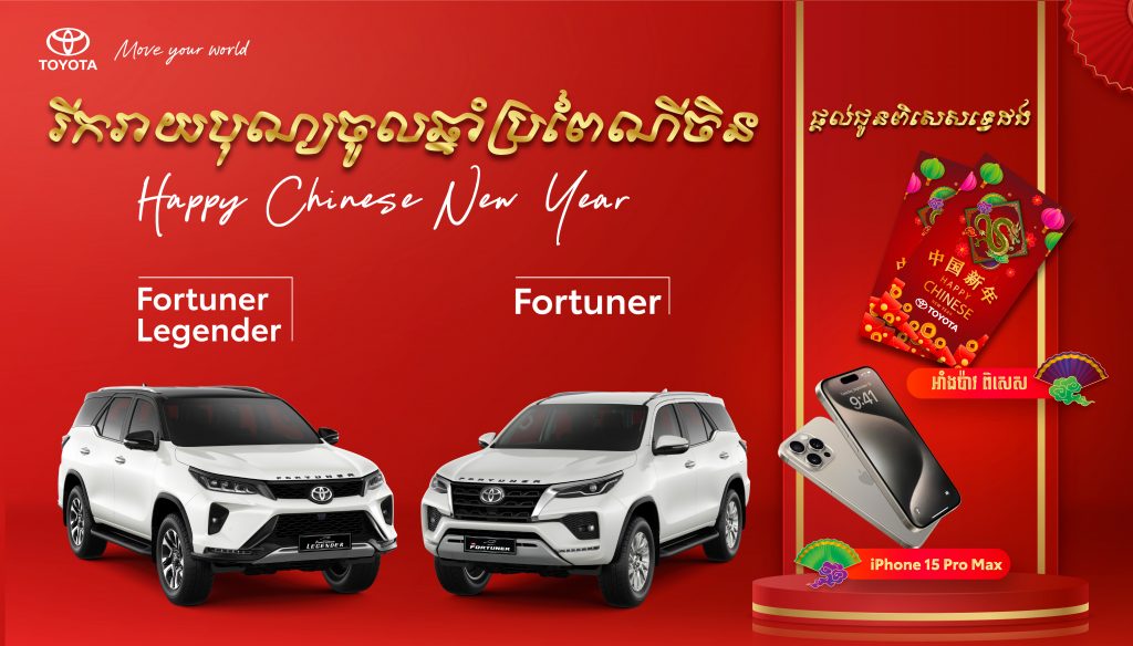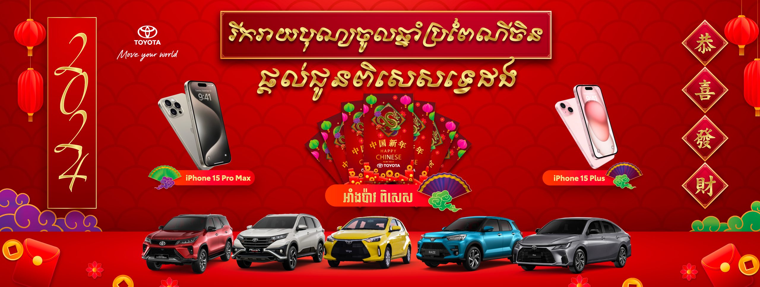 បើកទំព័រឆ្នាំថ្មី ២០២៤ ក្រុមហ៊ុន តូយ៉ូតា (ខេមបូឌា) ផ្តល់ជូនប្រមូសិនពិសេសទៅកាន់អតិថិជនយ៉ាង ច្រើនសន្ធឹកសន្ធាប់ ដើម្បីអបអរសាទរឆ្នាំថ្មី ឆ្នាំសកលផង និង បុណ្យចូលឆ្នាំប្រពៃណ៏ចិនផង ។ រាល់ការ ជាវថយន្ត Toyota Fortuner Toyota Fortuner Legender លោកអ្នកនឹងទទួលបានទូរស័ព្ទ ដៃ Iphone 15 Pro Max 256G មួយគ្រឿងភ្លាមៗ។ មិនមែនមានតែម៉ូឌែលនេះ 19 Toyota Vios. Toyota Raize, Toyota Rush (All Grade) និង Toyota Wigo លោកអ្នកក៏នឹងទទួលបាន ទូរស័ព្ទដៃ Iphone 15 Plus 128G មួយគ្រឿងភ្លាមដូចគ្នា ។