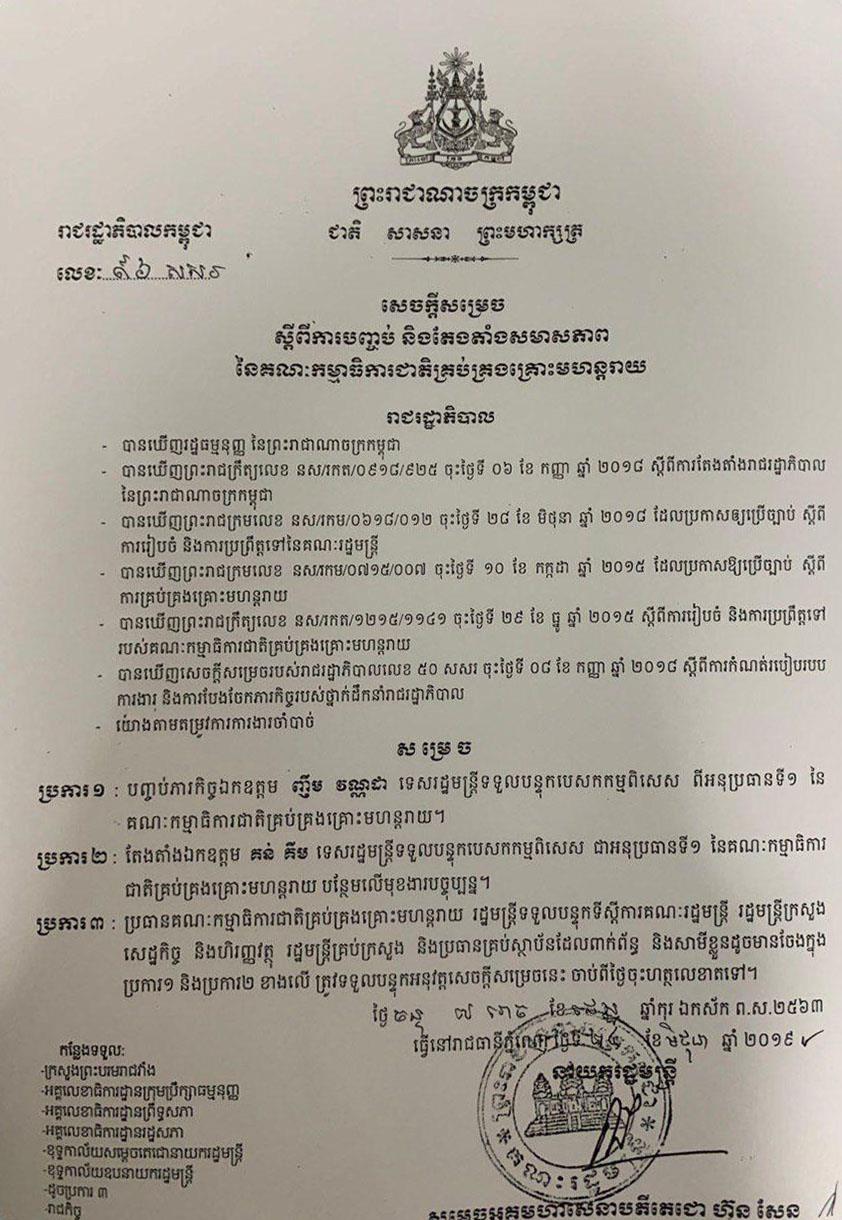 ប្រភពច្បាស់ការ៖ តែងតាំងឯកឧត្ដម គន់ គីម ជាអនុប្រធានទី១ នៃគណៈកម្មាធិការជាតិគ្រប់គ្រងគ្រោះមហន្តរាយ ជំនួសទេសរដ្ឋមន្រ្តី ញឹម វណ្ណដា ។ លោក គួច ចំរេីន អភិបាលខេត្តកំពង់ចាម មកជំនួស លោក យន្ត មីន អភិបាលខេត្តព្រះសីហនុ ដែលសុំលាលែងពីមុខតំណែង ។