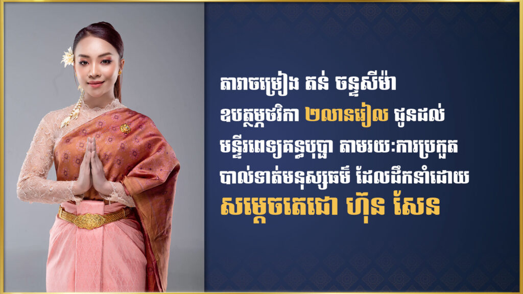 តារាចម្រៀង តន់ ចាន់សីម៉ា បានចូលរួមឧបត្ថម្ភ ២លានរៀល ជូនដល់មន្ទីរពេទ្យគន្ធបុប្ផា តាមរយៈការប្រកួតបាល់ទាត់មនុស្សធម៌ របស់ក្រុមបាល់ទាត់តារាកម្ពុជា (Cambodia football super stars) ដែលដឹកនាំដោយ សម្តេចតេជោ ហ៊ុន សែន ប្រធានព្រឹទ្ធសភា នៅពហុកីឡដ្ឋានជាតិអូឡាំពិក នាថ្ងៃទី០១ ខែឧសភា ឆ្នាំ២០២៤ ខាងមុខនេះ។