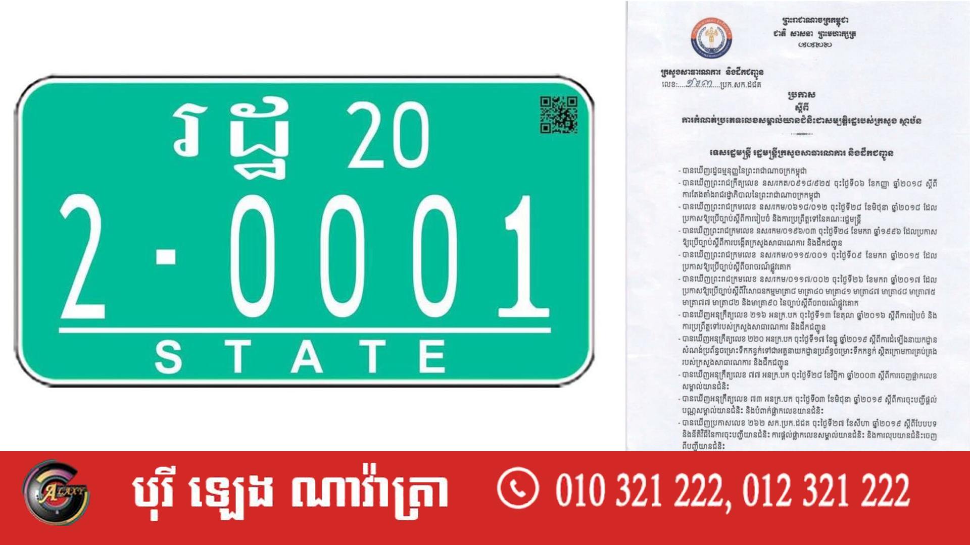 ក្រសួងសាធារណការ និងដឹកជញ្ជូន បានដាក់ចេញលេខសម្គាល់ យានជំនិះជាសម្បត្ដិរដ្ឋរបស់ក្រសួង ស្ថាប័ននីមួយៗ ដើម្បីធានា សន្តិសុខ សណ្តាប់ធ្នាប់ សុវត្ថិភាព និងសិទ្ធិជាកម្មសិទ្ធិលើយានជំនិះរបស់ក្រសួង ស្ថាប័ន។ នេះបើយោងតាមសេចក្ដីប្រកាសរបស់ក្រសួងសាធារណការ និងដឹកជញ្ជូន ចុះថ្ងៃទី២២ ខែមេសា ឆ្នាំ២០២០។