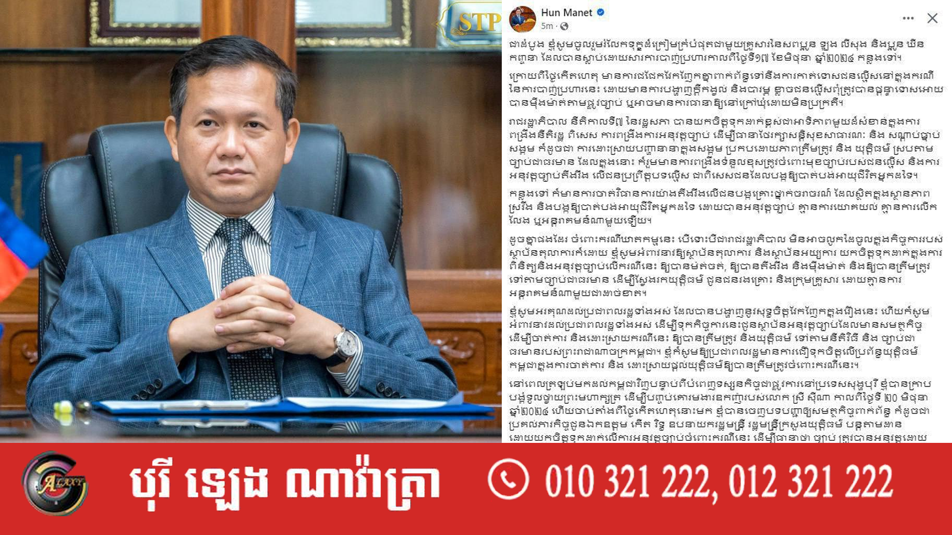 សម្ដេចនាយករដ្ឋមន្រ្ដីបានថ្លែង អរគុណដល់ប្រជាពលរដ្ឋទាំងអស់ ដែលបានបង្ហាញនូវសុទ្ធចិត្តវែកញែកក្នុងរឿងនេះ ហើយក៏សូមអំពាវនាវដល់ប្រជាពលរដ្ឋទាំងអស់ ដើម្បីទុកកិច្ចការនេះជូនស្ថាប័នអនុវត្តច្បាប់ដែលមានសមត្ថកិច្ច ដើម្បីចាត់ការ និងដោះស្រាយករណីនេះ ឱ្យបានត្រឹមត្រូវ និងយុត្តិធម៌ ទៅតាមនីតិវិធី និង ច្បាប់ជាធរមានរបស់ព្រះរាជាណាចក្រកម្ពុជា។ ខ្ញុំក៏សូមឱ្យប្រជាពលរដ្ឋមានការជឿទុកចិត្តលើប្រព័ន្ធយុត្តិធម៌កម្ពុជាក្នុងការចាត់ការ និង ដោះស្រាយផ្តល់យុត្តិធម៌ឱ្យបានត្រឹមត្រូវចំពោះករណីនេះ។