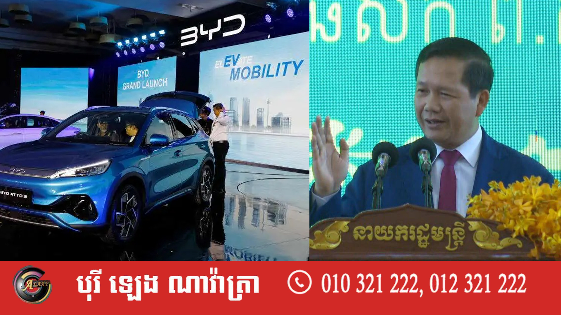សម្តេចធិបតី ហ៊ុន ម៉ាណែត នាយករដ្ឋមន្រ្តីនៃកម្ពុជា បានថ្លែងថា ក្រុមហ៊ុន BYD ដែលល្បីខាងផលិតរថយន្តប្រើថាមពលអគ្គិសនី គ្រោងនឹងបើកដំណើរការរោងចក្រដំឡើងរថយន្តរបស់ក្រុមហ៊ុននេះនៅកម្ពុជានាពេលឆាប់ៗខាងមុខ។