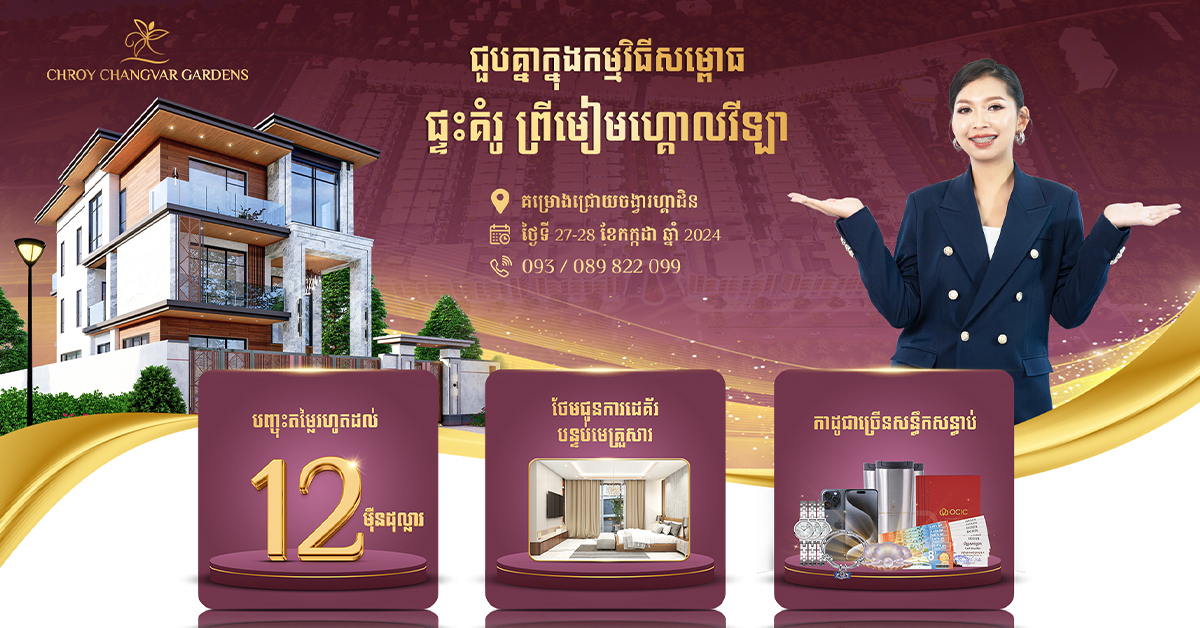 ដើម្បីកាន់តែជ្រាបច្បាស់ និងទទួលបាននូវការផ្ដល់ជូនដែលមិនធ្លាប់មានពីមុនមក សូមកុំភ្លេចចូលរួមជាភ្ញៀវកិត្តិយសរបស់យើងនាថ្ងៃនៃកម្មវិធីដែល កម្មវិធីបើកសម្ពោធផ្ទះគំរូ Premium Gold Villa នឹងប្រារព្ធទៅនៅទីតាំងរបស់គម្រោងផ្ទាល់ស្ថិតលើដងវិថី OCIC ភូមិព្រែកតាសេក សង្កាត់ព្រែកតាសេក ខណ្ឌជ្រោយចង្វារ នាថ្ងៃទី 27 និង 28 ខែកក្កដា ឆ្នាំ2024 ឬទំនាក់ទំនងមកកាន់សហការីផ្នែកលក់តាមរយៈលេខ 023 901 551 / 023 901 552 ឬ 089 822 009 / 093 822 009 ។