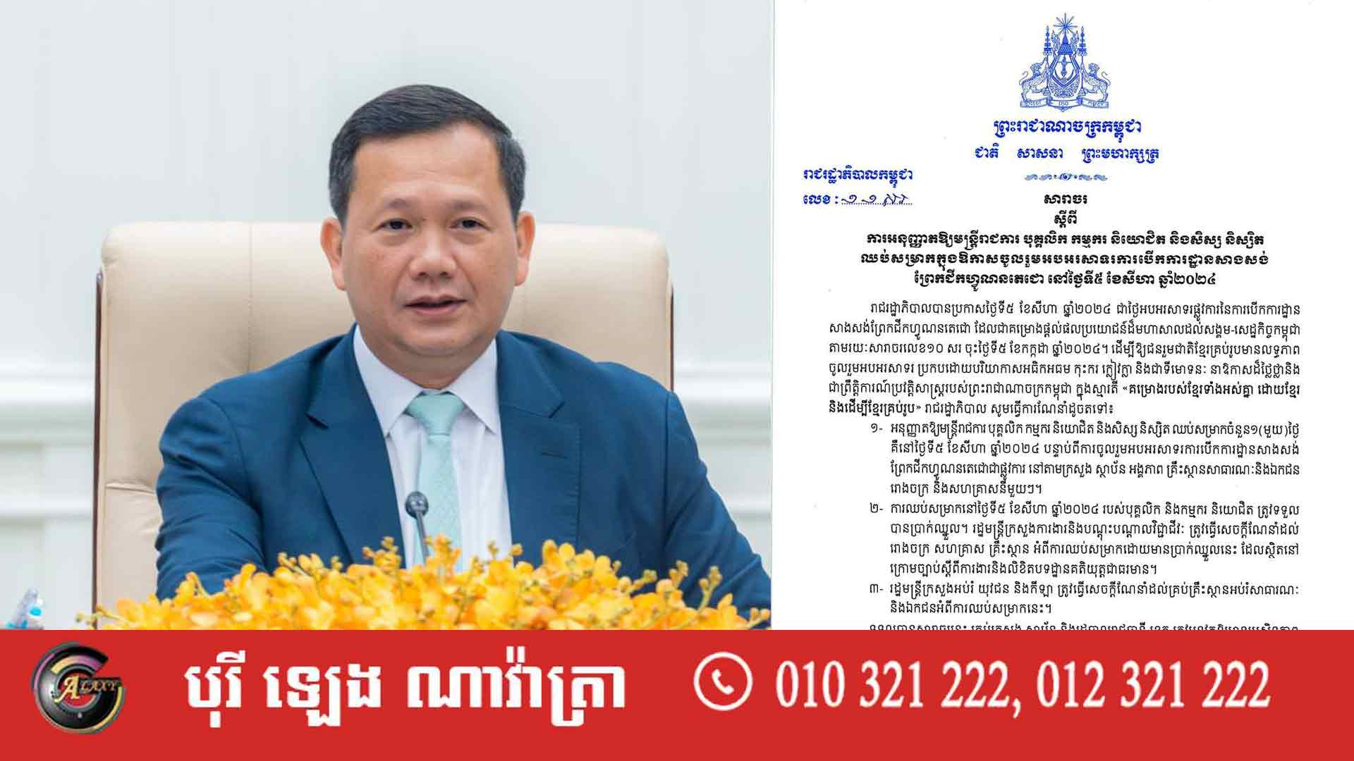 រាជរដ្ឋាភិបាល បានចេញសារាចរ ស្តីពី ការអនុញ្ញាតឱ្យមន្ត្រីរាជការ បុគ្គលិក កម្មករ និយោជិត និងសិស្ស និស្សិត ឈប់សម្រាក១ថ្ងៃ ក្នុងឱកាសចូលរួមអបអរសាទរការបើកការដ្ឋានសាងសង់ ព្រែកជីកហ្វូណនតេជោ នៅថ្ងៃទី៥ ខែសីហា ឆ្នាំ២០២៤ខាងមុខ។