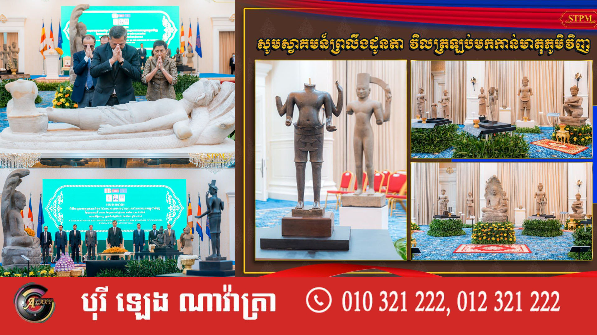 សម្ដេចធិបតី ហ៊ុន ម៉ាណែត នាព្រឹកថ្ងៃទី២២ ខែសីហា ឆ្នាំ២០២៤នេះ បានអញ្ជើញចូលរួមទទួលវត្ថុបុរាណខ្មែរ ចំនួន៧០ ដែលបានប្រគល់ត្រឡប់មកមាតុភូមិវិញ ក្រោយពីត្រូវបាត់បង់អស់រយៈពេលរាប់សិបឆ្នាំ។