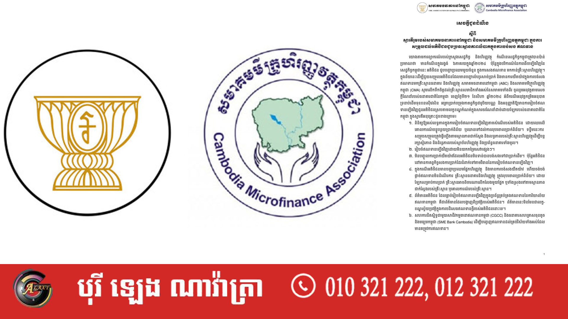 សមាគមធនាគារនៅកម្ពុជា និងសមាគមមីក្រូហិរញ្ញវត្ថុកម្ពុជា នៅថ្ងៃទី២៣ ខែសីហា ឆ្នាំ២០២៤ បានចេញសេចក្ដីជូនដំណឹងស្ដីពីការដាក់ចេញនូវស្មារតីរួមសម្រួលដល់អតិថិជនជួបប្រទះស្ថានភាពលំបាកក្នុងការបង់សង ឥណទាន។