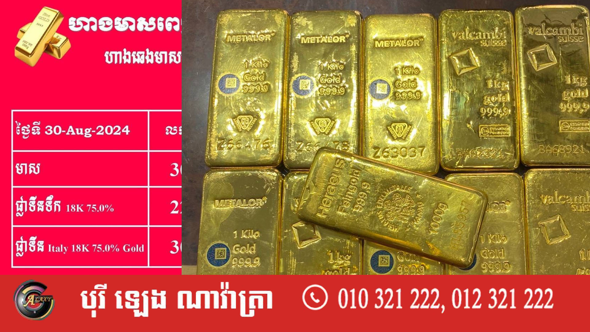 តម្លៃមាសនៅថ្ងៃទី៣០ ខែសីហា ឆ្នាំ២០២៤នេះ មានតម្លៃ៣០៥ដុល្លារក្នុងមួយជីជាតម្លៃលក់ចេញ ខណៈម្សិលមិញមាសមួយជីមានតម្លៃ៣០៤ដុល្លារ។
