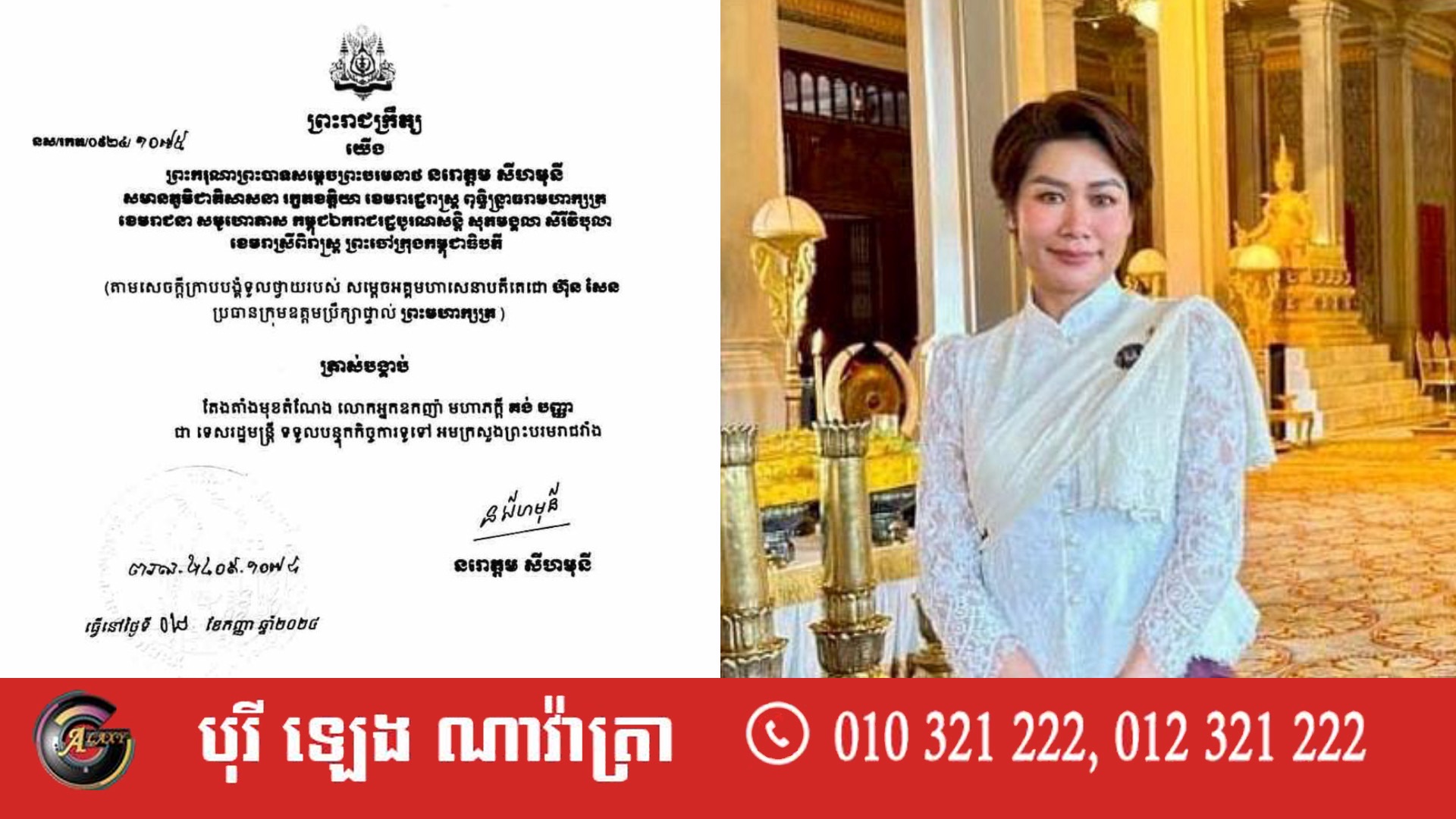 កូនស្រីសម្តេច គង់ សំអុល ទទួលការតាំងតាំងជា ទេសរដ្ឋមន្ត្រីទទួលបន្ទុកកិច្ចការទូទៅអមក្រសួងព្រះបរមរាជវាំង
