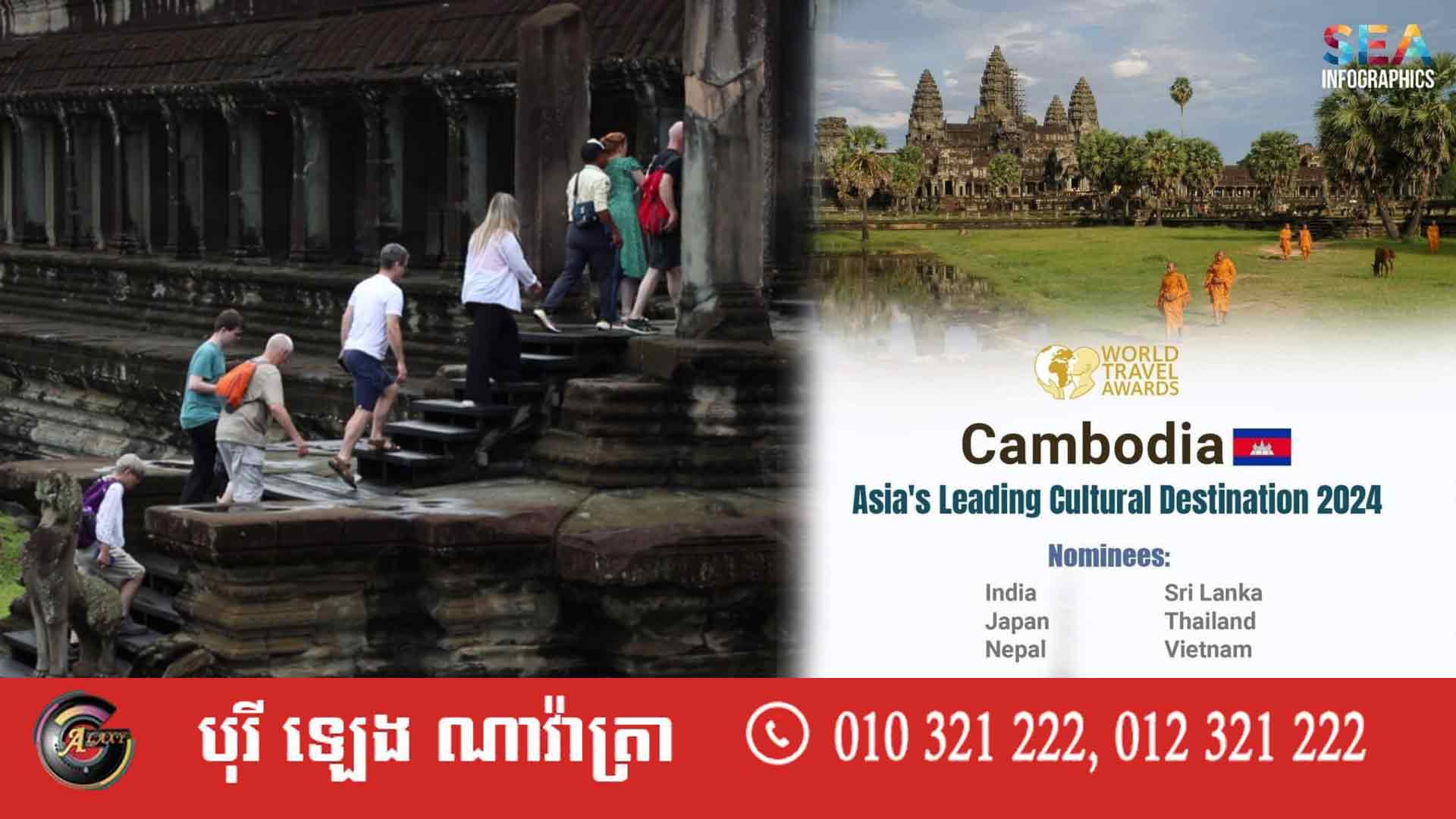 ក្រសួងទេសចរណ៍បានឱ្យដឹងថា កម្ពុជាត្រូវបានចាត់ទុកជាគោលដៅវប្បធម៌ឈានមុខគេនៅអាស៊ីសម្រាប់ឆ្នាំ ២០២៤ ដោយស្ថាប័នពានរង្វាន់ទេសចរណ៍ពិភពលោក ខណៈនេះជាលើកទីបួនហើយដែលកម្ពុជាបានឈ្នះពានរង្វាន់ដ៏អស្ចារ្យនេះ។