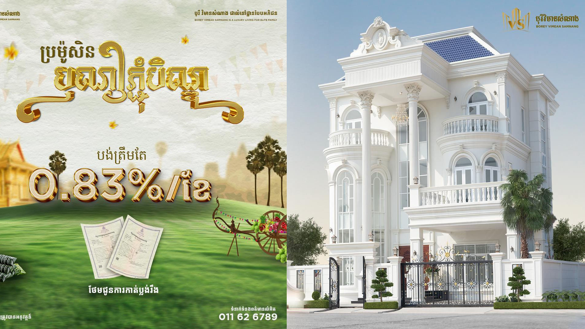 ប្រម៉ូសិនពិសេស! ក្នុងឱកាសបុណ្យភ្ជុំបិណ្ឌខាងមុខនេះ ទិញវីឡា បុរីវិមានសំណាង បង់ត្រឹមតែ ០.៨៣%ប៉ុណ្ណោះក្នុងមួយខែ ព្រមទាំងថែមការកាត់ប្លង់រឹង LMAPជូនទៀតផង