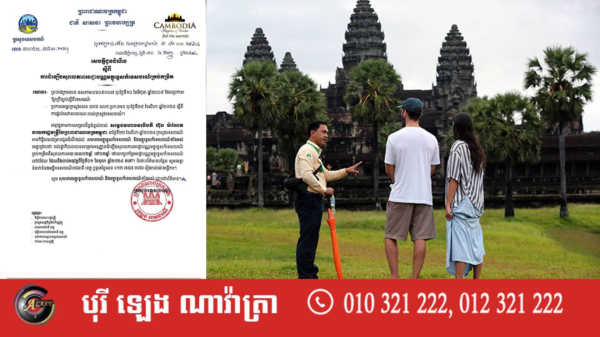 ក្រសួងទេសចរណ៍បានជូនដំណឹងនេះដល់ សមាគមមគ្គុទ្ទេសក៍ទេសចរណ៍ និងមគ្គុទ្ទេសក៍ទេសចរណ៍ទាំអស់ ឱ្យបានជ្រាបថា រាជរដ្ឋាភិបាលបានសម្រេចអនុញ្ញាដំឡើងសុពលភាពអាជ្ញាបណ្ណមគ្គុទេសក៍ទេសចរណ៍គ្រប់កម្រិតពីសុពលភាពរយៈពេល២ឆ្នាំ ទៅ៣ឆ្នាំ ដោយរក្សាកម្រៃអាជ្ញាបណ្ណមគ្គុទ្ទេសក៍ទេសចរណ៍នៅដដែល។ ដែលការអនុវត្ដន៍នេះនឹងគិតចាប់ពីថ្ងៃទី១ ខែតុលា ឆ្នាំ២០២៤។