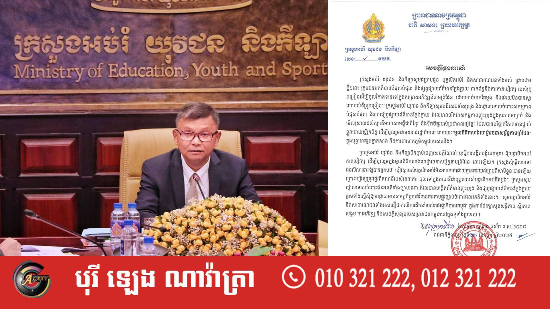 ក្រសួងអប់រំ យុវជន និងកីឡា បានបដិសេធច្រានចោលទាំងស្រុង ដែលបំភ្លៃថា មានកាត់ប្រាកខែរបស់គ្រូ ដើម្បីចូលវិភាគទានកសាងផ្លូវក្រវ៉ាតព្រំដែន ខណៈក្រសួងក៏បានចាត់ទុកថា នេះគឺចរិតនិងសកម្មភាពញុះញង់ក្នុងរូបភាពអាក្រក់ និងមើលស្រាលដល់ស្មារតីមហាសាមគ្គីជាតិខ្មែរ។