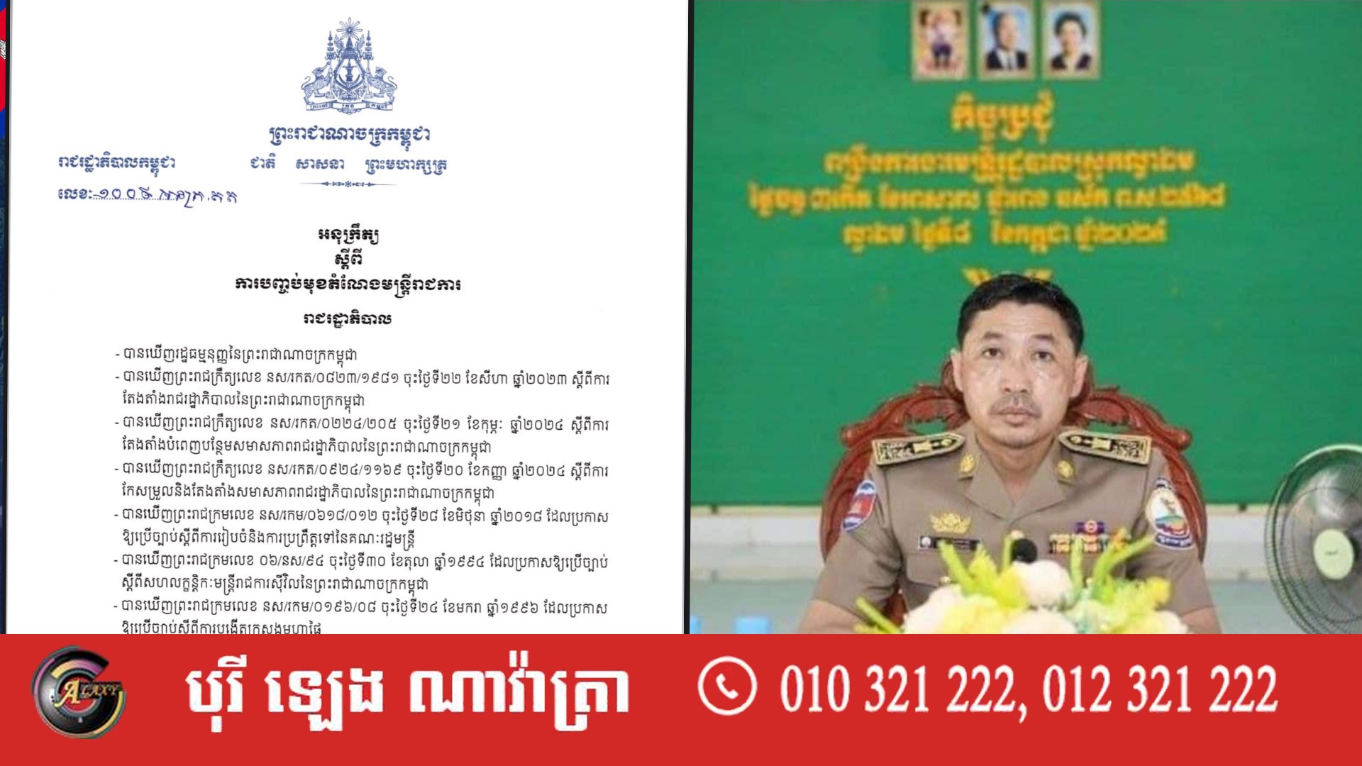 សម្តេចធីបតី ហ៊ុន ម៉ាណែត នាយករដ្ឋមន្ត្រីកម្ពុជា នៅថ្ងៃទី០៨ ខែតុលា ឆ្នាំ២០២៤នេះ បានចេញអនុក្រឹត្យបញ្ចប់មុខតំណែង លោក កន សុខកាយ ឋានន្តរស័ក្តិឧត្តមមន្ត្រី ថ្នាក់លេខ៥ ពីអភិបាលនៃគណៈអភិបាលស្រុកល្វាឯម ខេត្តកណ្តាល។