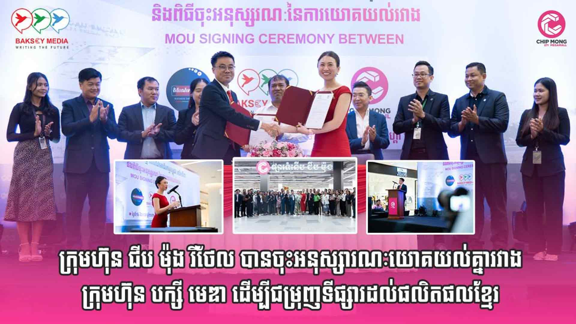 រាជធានីភ្នំពេញ៖ កាលពីថ្ងៃទី ១៤ ខែតុលា ឆ្នាំ ២០២៤ កន្លងទៅនេះ ក្រុមហ៊ុន ជីប ម៉ុង រីថែល និង ក្រុមហ៊ុន បក្សី មេឌា បានធ្វើការចុះអនុស្សរណៈយោគយល់គ្នា ក្នុងការបង្កើតកម្មវិធី “ជំនួបដៃគូអាជីវកម្ម និងពិព័រណ៍អាជីវកម្មកម្ពុជា” ដើម្បីចាប់ដៃគូរសហការជាកម្លាំងចលករជម្រុញទៅដល់ម្ចាស់អាជីវកម្ម និងផលិតផលខ្មែរឱ្យកាន់តែប្រសើរឡើងមួយកម្រិតទៀត។