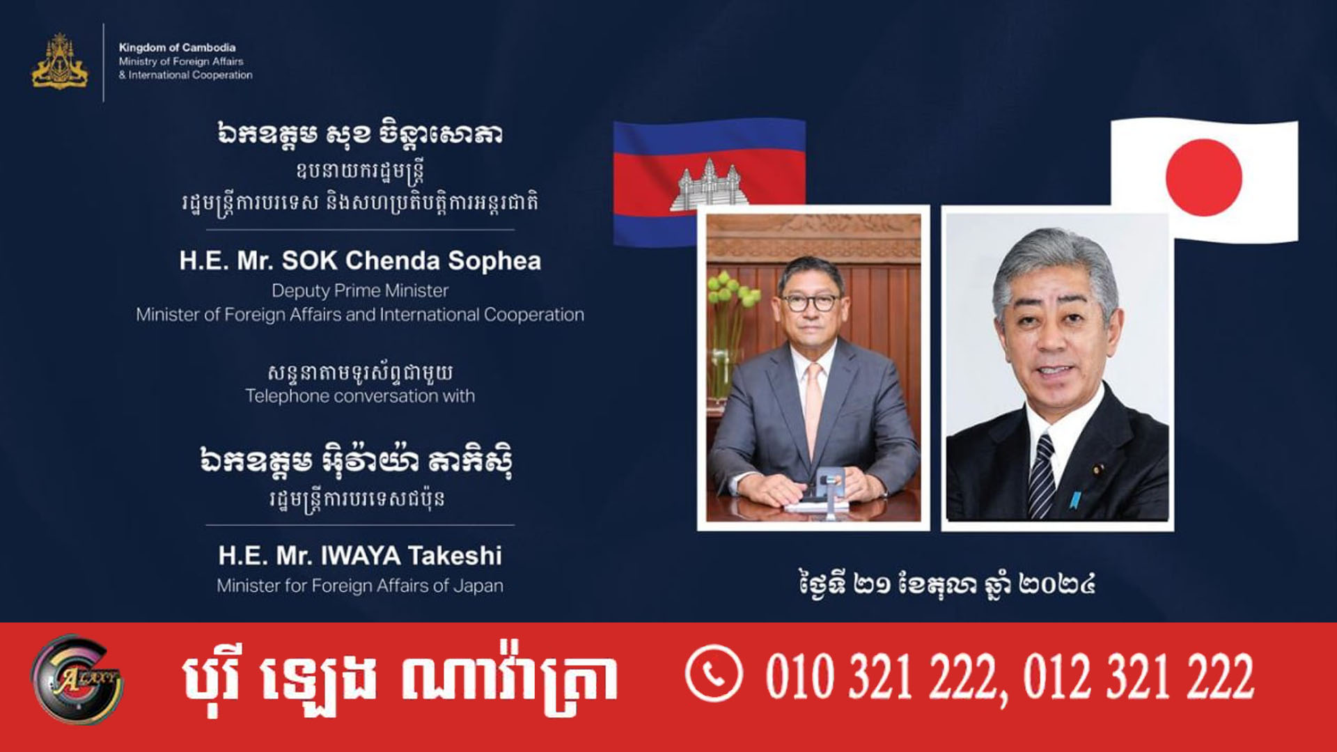 ក្រសួងបរទេសកម្ពុជា-ជប៉ុន បានបង្ហាញពីការតាំងចិត្ត ថានឹងរួមគ្នាពង្រឹងភាពជាដៃគូយុទ្ធសាស្ត្រគ្រប់ជ្រុងជ្រោយរវាងប្រទេសទាំងពីរឱ្យកាន់តែខ្លាំងថែមទៀត។ការប្តេជ្ញានេះ បានបញ្ជាក់ឡើងនៅក្នុងជំនួបពិភាក្សាការងារតាមទូរស័ព្ទរវាងលោក សុខ ចិន្តាសោភា ឧបនាយករដ្ឋមន្ត្រី និងជារដ្ឋមន្ត្រីការបរទេស និងសហប្រតិបត្តិការអន្តរជាតិ និងលោក IWAYA Takeshi រដ្ឋមន្ត្រីការបរទេសជប៉ុន ដែលទើបទទួលបានការតែងតាំងថ្មី កាលថ្ងៃទី២១ ខែតុលា ឆ្នាំ២០២៤។