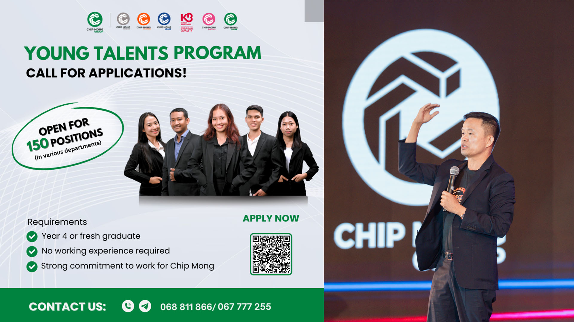 ភ្នំពេញ៖ ជីប ម៉ុង ជាក្រុមហ៊ុនយក្សដ៏ល្បីល្បាញ និងជាក្រុមហ៊ុនដែលមានស្តង់ដាមួយនៅកម្ពុជា បានប្រកាសផ្ដល់ឱកាសដល់ប្អូនៗ សិស្ស-និស្សិត ដែលកំពុងតែសិក្សាក្នុងឆ្នាំបញ្ចប់ថ្នាក់បរិញ្ញាបត្រ និងនិស្សិតទើបបញ្ចប់ការសិក្សាចំនួន ១៥០នាក់ នូវឱកាសចូលរួមក្នុងកម្មវិធីហាត់ការ ឬ Young Talents ដែលមានរយៈពេល ៣ខែ។