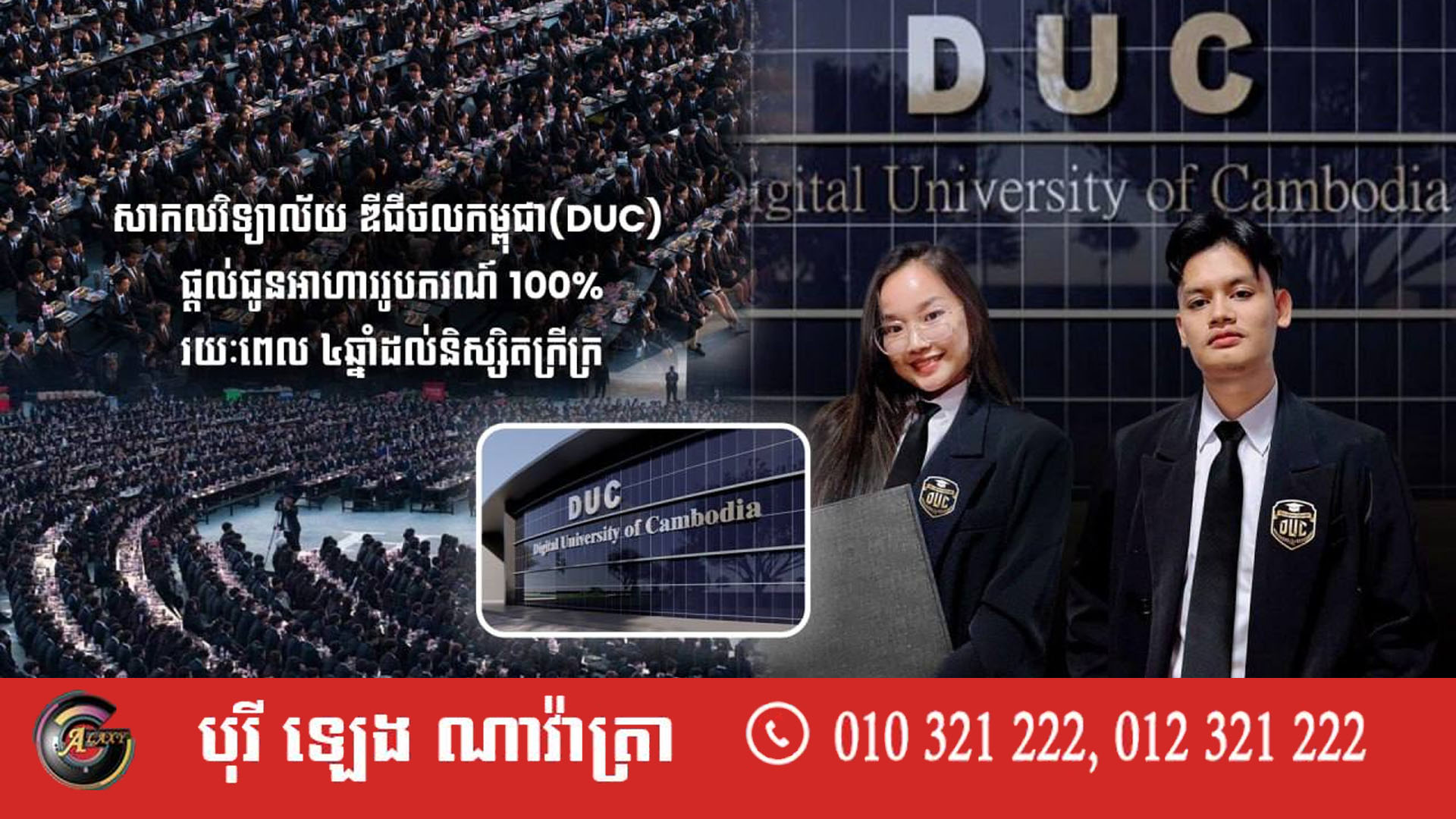 ឱកាសសម្រាប់ប្អូនៗ ដែលទើបតែប្រឡងបាក់ឌុបហើយថ្មីៗ មិនថាជាប់ឬធ្លាក់បាក់ឌុប សាកលវិទ្យាល័យ ឌីជីថលកម្ពុជា Digital University of Cambodia.(DUC) នឹងផ្ដល់ជូនអាហាររូបករណ៍ 100% រយៈពេល ៤ឆ្នាំដល់និស្សិតក្រីក្រដែលមានជីវភាពខ្វះខាត មកពីតាមបណ្ដាររាជធានី ខេត្ដនានា។