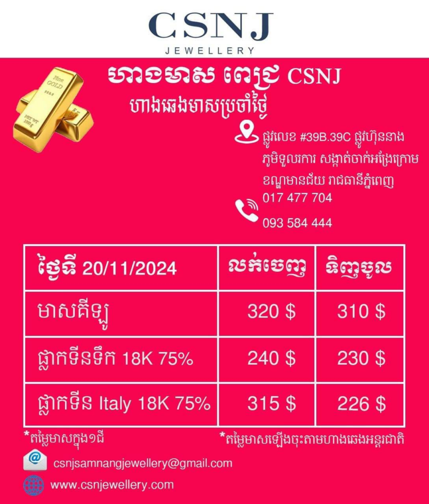 យោងតាមហាងលក់គ្រឿងអលង្ការ CSNJ របស់លោកឧកញ៉ា ចិន សំណាង បានឱ្យដឹងនៅថ្ងៃទី២០ ខែវិច្ឆិកា ឆ្នាំ២០២៤នេះថា មាស មានតម្លៃ៣២០ដុល្លារក្នុងមួយជី ជាតម្លៃលក់ចេញ និងទិញចូល ៣១០ដុល្លារ។ ចំណែកផ្លាទីនទឹក៧៥ លក់ចេញមានតម្លៃ ២៤០ដុល្លារ និងទិញចូលក្នុងតម្លៃ ២៣០ដុល្លារ, ចំណែកឯផ្លាទីន Italy 18K 75.0% Gold លក់ចេញក្នុងតម្លៃ ៣១៥ដុល្លារ ទិញចូល២២៦ដុល្លារ។