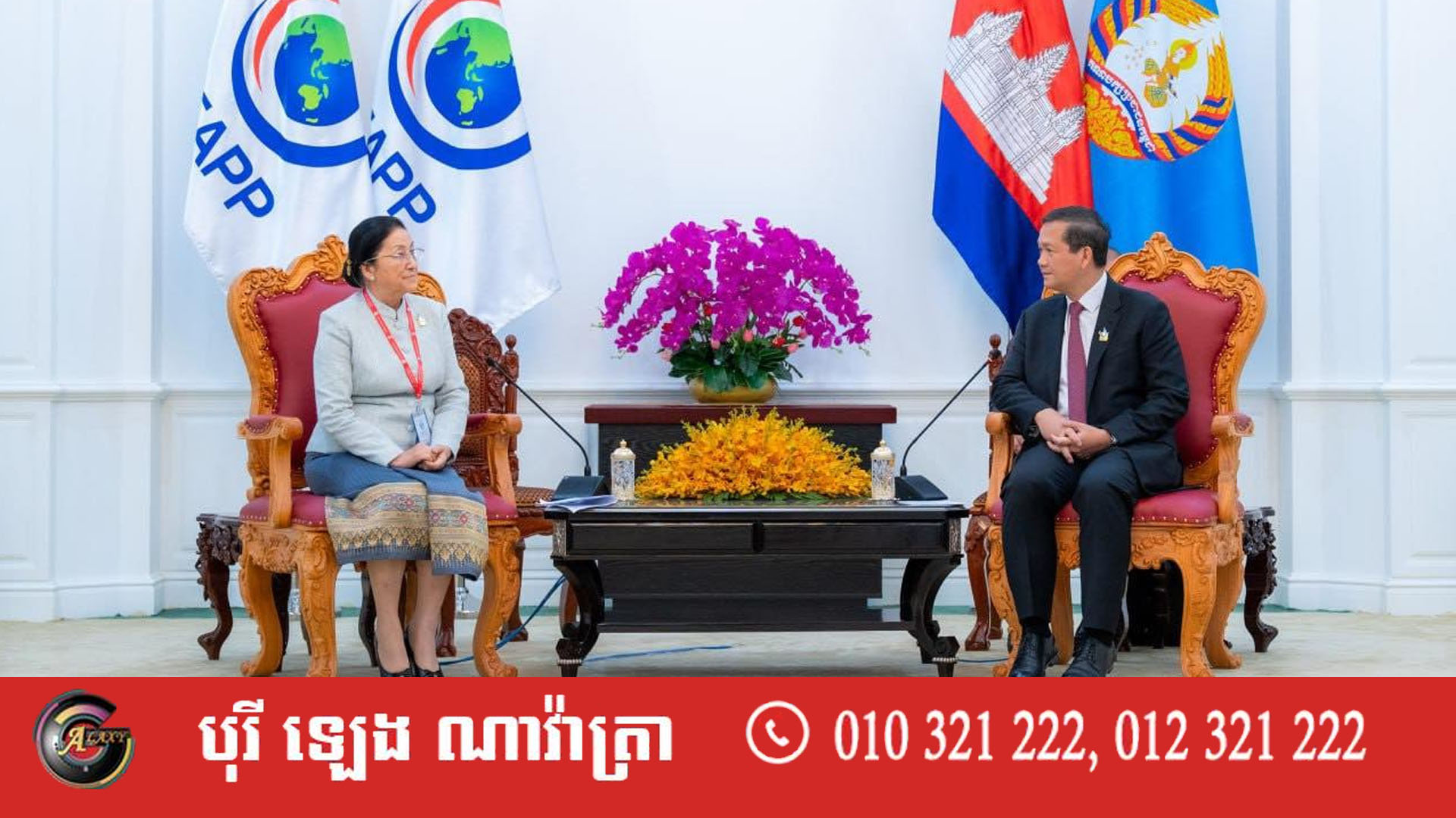 សម្ដេចធិបតី និងលោកស្រីអនុប្រធានរដ្ឋឡាវ បានបើកិច្ចពិភាក្សាលើការបន្តជំរុញកិច្ចសហប្រតិបត្តិការរវាងប្រទេសទាំងពីរ លើវិស័យអាទិភាពសំខាន់ចំនួន៨ ដើម្បីពង្រីកទំនាក់ទំនងប្រទេសទាំងពីរកាន់តែខ្លាំងឡើងថែមទៀត។ កិច្ចពិភាក្សារវាងភាគីទាំងពីរ​ បានធ្វើឡើងនាព្រឹកថ្ងៃទី២២ ខែវិច្ឆិកា ឆ្នាំ២០២៤ ក្នុងឱកាសចូលរួមមហាសន្និបាតសន្និសីទអន្តរជាតិ នៃបណ្តាគណបក្សនយោបាយនៅអាស៊ី (ICAPP)​ លើកទី១២​ និងកិច្ចប្រជុំពាក់ព័ន្ធ នៅវិមាន៧មករា រាជធានីភ្នំពេញ។