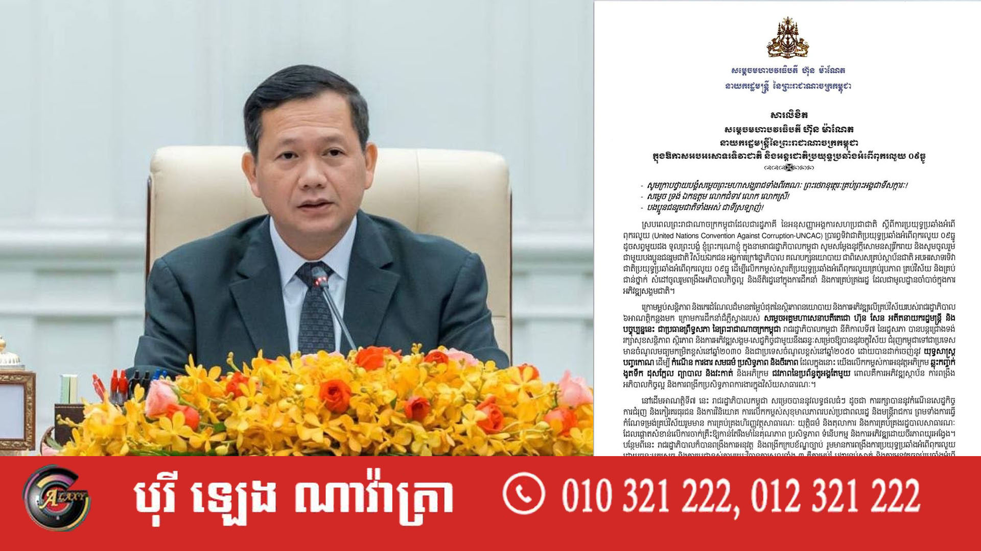 សម្តេចធិបតី ហ៊ុន ម៉ាណែត នាយករដ្ឋមន្ត្រីកម្ពុជា  បានស្នើឱ្យគ្រប់ស្ថាប័នពាក់ព័ន្ធអនុវត្តន៍វិធានការចំនួន ៥ ដើម្បីប្រឆាំងអំពើពុករលួយគ្រប់រូបភាព សំដៅចូលរួមពង្រឹងអភិបាលកិច្ចល្អ និងនីតិរដ្ឋនៅក្នុងការដឹកនាំ និងការគ្រប់គ្រងរដ្ឋ ដែលជាមូលដ្ឋានចាំបាច់ក្នុងការអភិវឌ្ឍសង្គមជាតិ។នេះបើតាមសារលិខិតក្នុងឱកាសអបអរសាទរទិវាជាតិ និងអន្តរជាតិប្រយុទ្ធប្រឆាំងអំពើពុករលួយ ០៩ធ្នូ ដែលផ្សាយចេញនៅថ្ងៃទី៤ ខែវិច្ឆិកា ឆ្នាំ២០២៤។