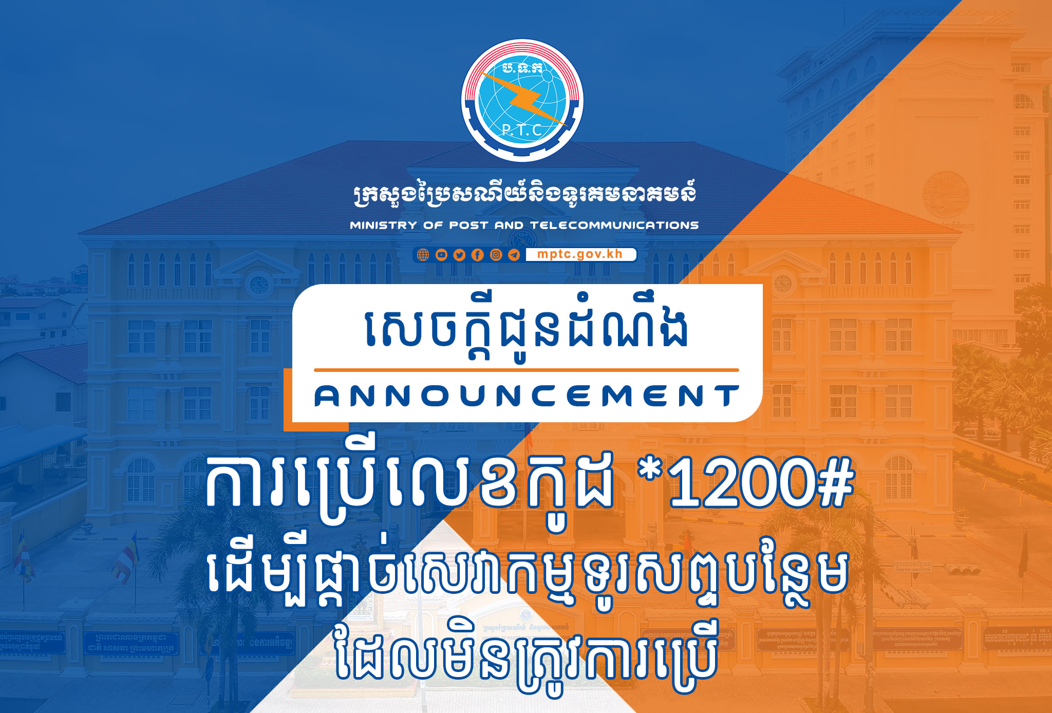 ក្រសួងប្រៃសណីយ៍ និងទូរគមនាគមន៍ បានសេចក្តីប្រកាសព័ត៌មាន អំពីការប្រើលេខកូដ *1200# ដើម្បីផ្តាច់សេវាកម្មទូរសព្ទបន្ថែម ដែលមិនត្រូវការប្រើ នៅថ្ងៃទី១១ ខែធ្នូ ឆ្នាំ២០២០នេះ។