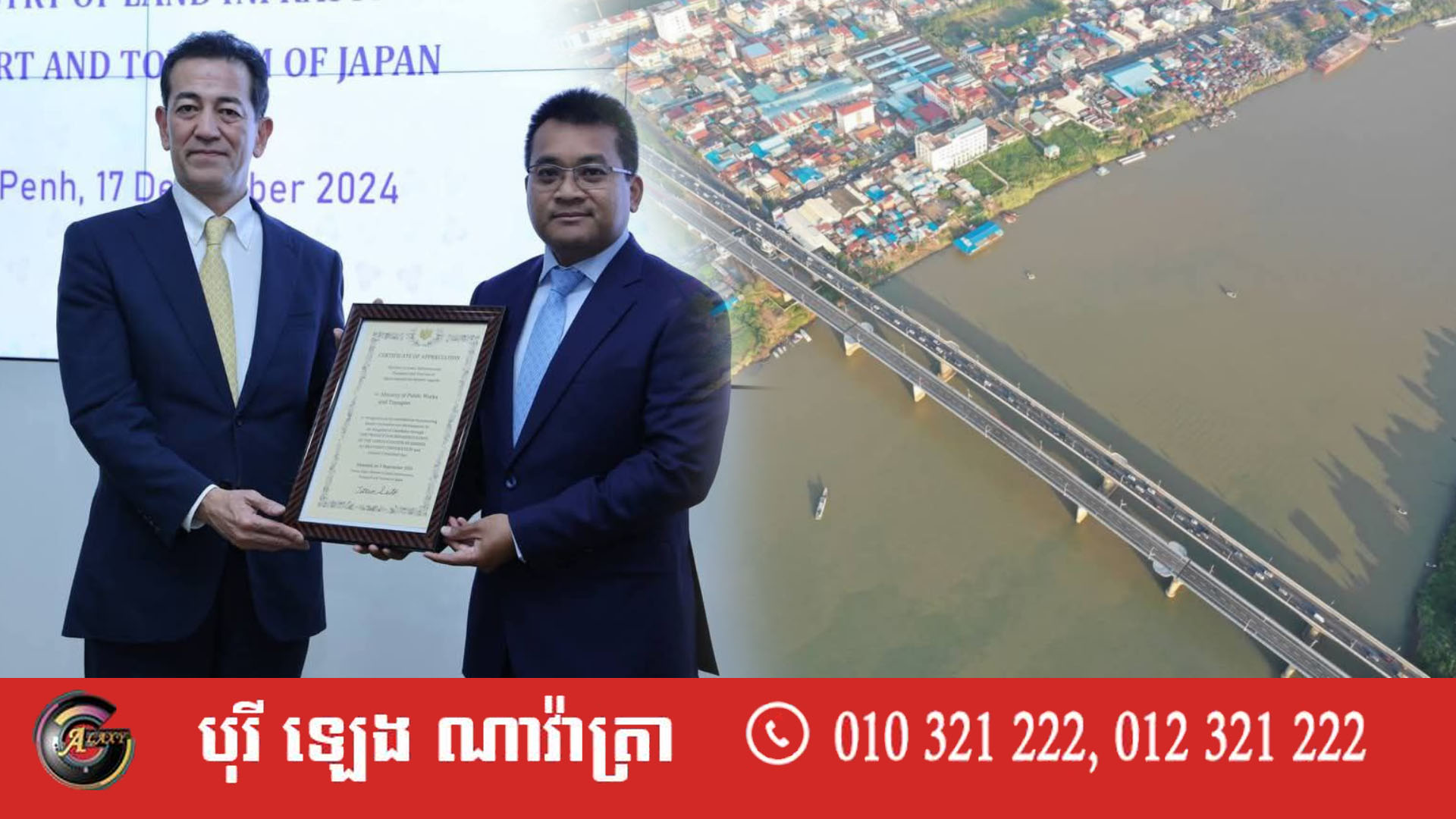 ពិធីប្រគល់លិខិតសរសើរនេះ បានធ្វើឡើង កាលរសៀលថ្ងៃទី១៧ ខែធ្នូ ឆ្នាំ២០២៤ ក្រោមអធិបតី លោក ប៉េង ពោធិ៍នា រដ្ឋមន្ត្រីក្រសួងសាធារណការ និងដឹកជញ្ជូន អ្នកទទួលលិខិតសរសើរ (Certificate of Appreciation) ពី លោក OGASAWARA Kenichi អនុរដ្ឋមន្រ្តីក្រសួងដែនដី ហេដ្ឋារចនាសម្ព័ន្ធ ដឹកជញ្ជូន និងទេសចរណ៍ជប៉ុន (MLIT)។