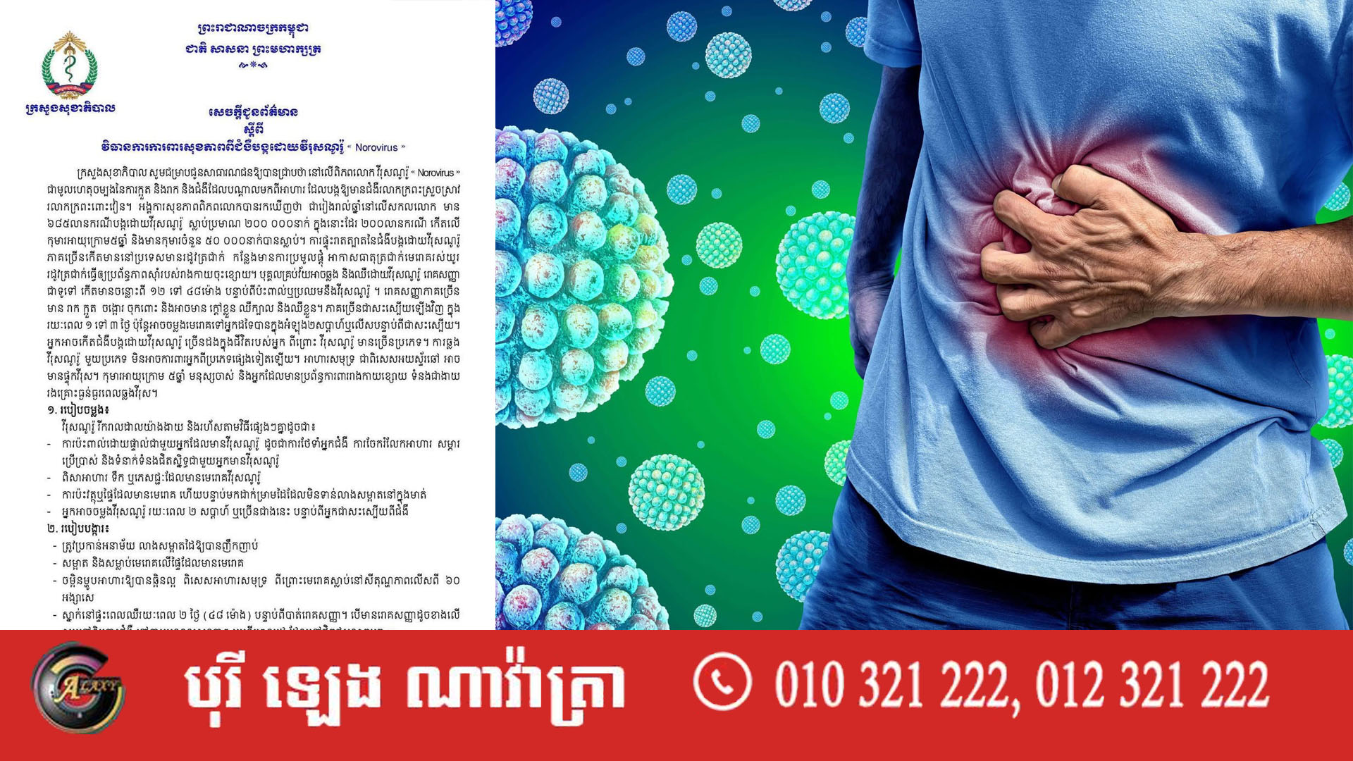 ក្រសួងសុខាភិបាល បានប្រកាសថា នៅលើពិភពលោក វីរុសណូរ៉ូ « Norovirus » ជាមូលហេតុចម្បងនៃការក្អួត និងរាក និងជំងឺដែលបណ្តាលមកពីអាហារ ដែលបង្កឱ្យមានជំងឺរលាកក្រពះស្រួចស្រាវ រលាកក្រពះពោះវៀន។ ទន្ទឹមគ្នានេះ ក្រសួងក៏បានប្រាប់ពីវិធីការពារខ្លួនពីការផ្ទុះរាតត្បាតនៃជំងឺនេះផងដែរ។