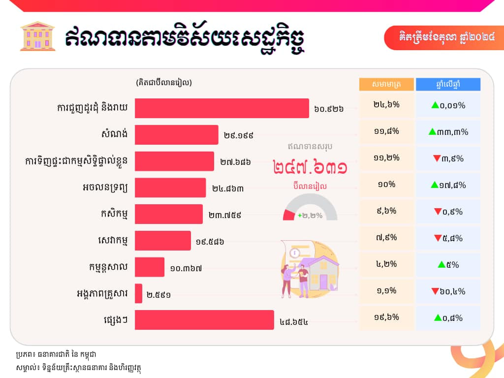 សូមបញ្ជាក់ថា ទំហំឥណទានតាមវិស័យសេដ្ឋកិច្ចគិតចាប់ពីខែមករា ដល់ខែតុលា ឆ្នាំ២០២៤ រួមមាន ការជួញដូរដុំ និងរាយ មាន៦០.៩២៥ប៊ីលានរៀល សំណង់ ២៧.១៩៩ប៊ីលានរៀល ការទិញផ្ទះជាកម្មសិទ្ធិផ្ទាល់ខ្លួន ២៧.៦៨៩ប៊ីលានរៀល អចលនទ្រព្យ ២៤.៨៦៣ប៊ីលានរៀល កសិកម្ម ២៣.៧៥៩ប៊ីលានរៀល សេវាកម្ម ១៩.៥៨៦ប៊ីលានរៀល កម្មន្តសាល ១០.៣៦៧ប៊ីលានរៀល អង្គភាពគ្រួសារ ២.៥៩១ប៊ីលានរៀល និងផ្សេងៗ ៤៨.៦៥៤ប៊ីលានរៀល៕