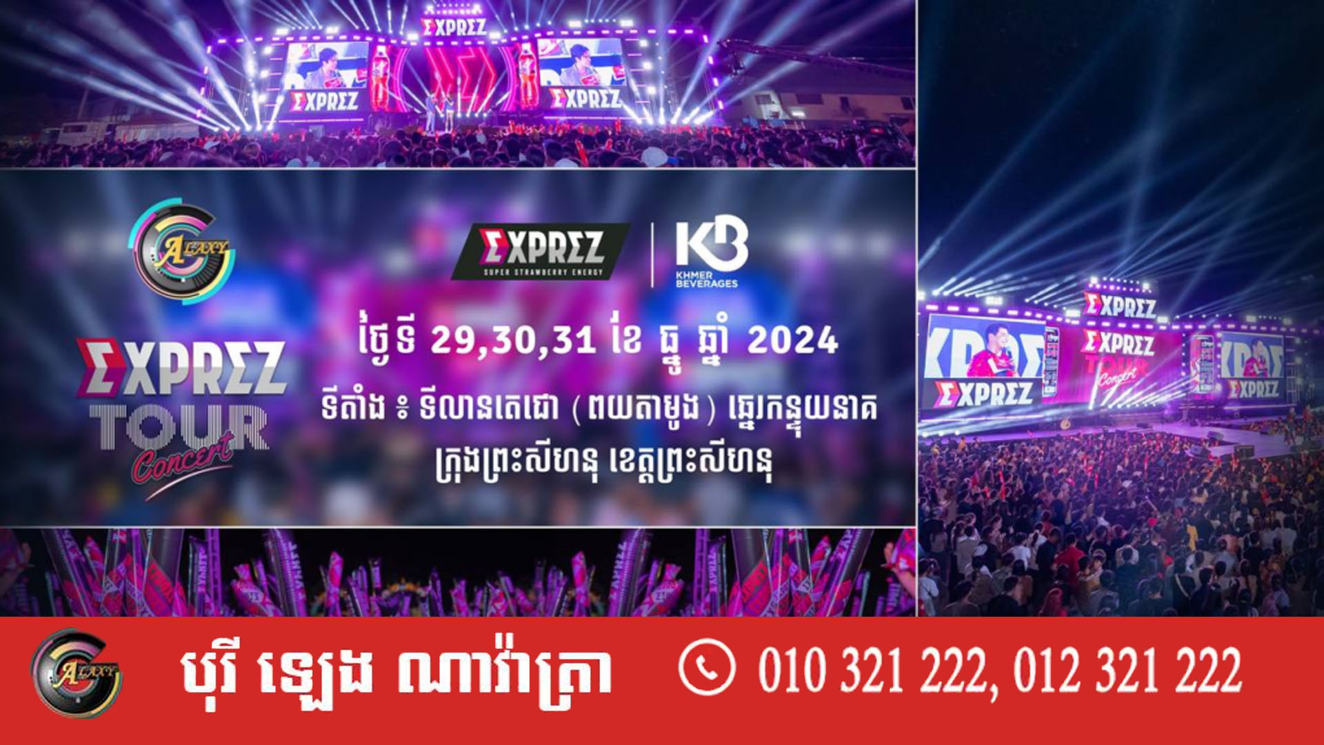 មហាព្រឹត្តិការណ៍ប្រគំតន្រ្តីប្រចាំប្រទេស Exprez Tour Concert របស់ ក្រុមហ៊ុនខ្មែរ ប៊ែវើរីជីស សហការជាមួយផលិតកម្មGalaxy Navatra បានធ្វើដំណើរមកដល់ខេត្តព្រះសីហនុហើយ ដើម្បីអបអរសារទរថ្ងៃឆ្លងឆ្នាំសកល 2024 ចូល 2025 ការប្រគំតន្ត្រីខ្នាតយក្សមួយនេះ នឹងនាំយកកំពូលតារាចម្រៀងប្រចាំប្រទេសជាច្រើនដួង មកអង្រួនឆាក បង្កើតទស្សនីយភាពដ៏អស្ចារ្យ បម្រើអារម្មណ៍ពុកម៉ែបងប្អូន អាចចូលរួមទទួលយកភាពសប្បាយរីករាយ និងរាំលេងកម្សាន្ត ជាមួយនឹង ចង្វាក់ភ្លេងគ្រប់ស្ទាយ ព្រមទាំងបានជួបជាមួយអាយដលជាច្រើនដួងផងដែរ ។