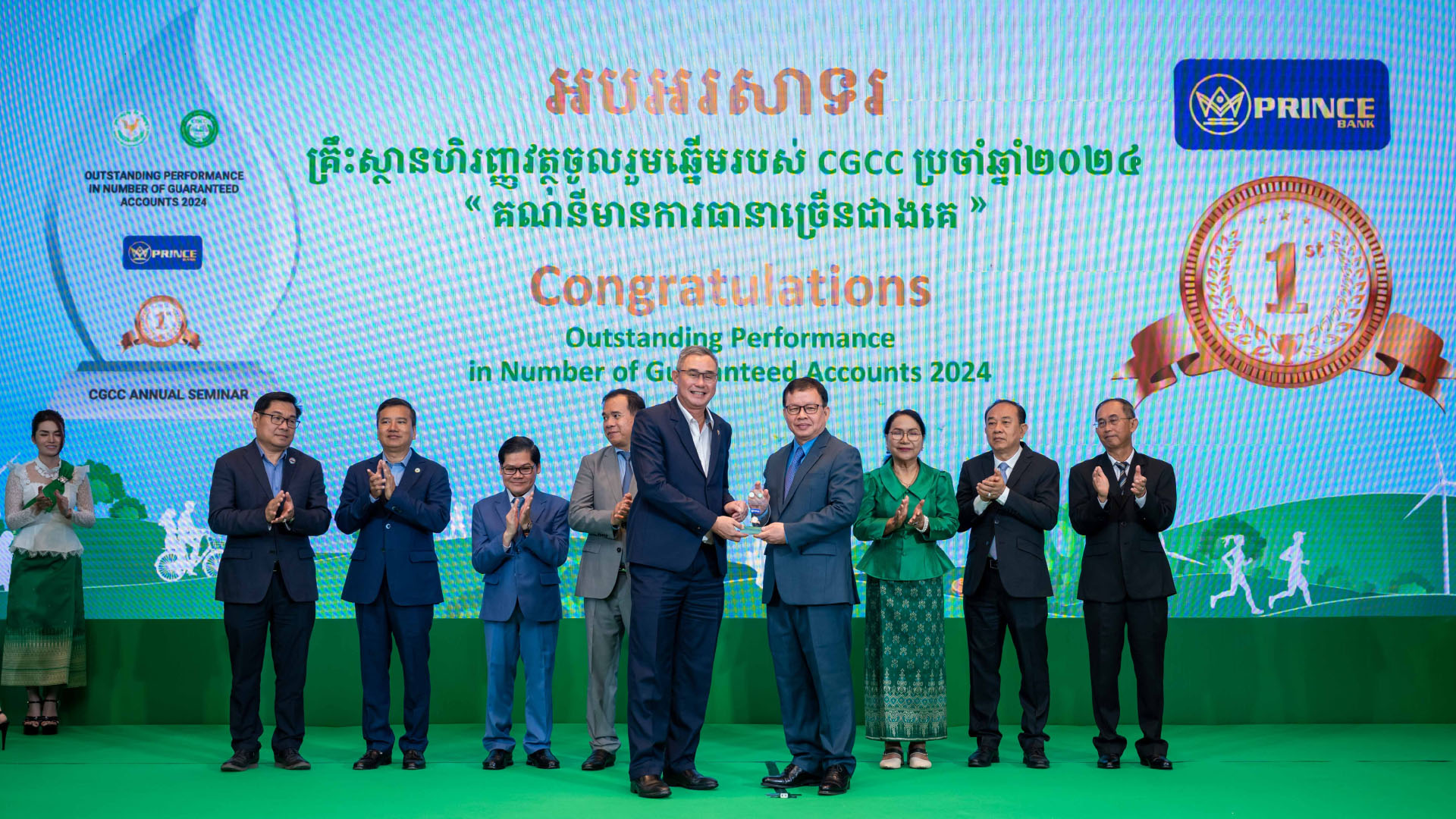 ធនាគារ ព្រីនស៍ មានក្តីសោមនស្សរីករាយ ដែលទទួលបានការទទួលស្គាល់ជាគ្រឹះស្ថានហិរញ្ញវត្ថុចូលរួមឆ្នើមរបស់ CGCC ប្រចាំឆ្នាំ2024 “គណនីមានការធានាច្រើនជាងគេ” ពីសាជីវកម្មធានាឥណទានកម្ពុជា (CGCC)។ កម្មវិធីប្រគល់ពានរង្វាន់ដ៏មានកិត្យានុភាពនេះ ត្រូវបានធ្វើឡើងនៅសណ្ឋាគារ ហៃយ៉ាត់ រីជិនស៊ី ភ្នំពេញ និងប្រគល់ដោយផ្ទាល់ដោយឯកឧត្ដម រស់ សីលវ៉ា រដ្ឋលេខាធិការនៃក្រសួងសេដ្ឋកិច្ចនិងហិរញ្ញវត្ថុ និងជាប្រធានក្រុមប្រឹក្សាភិបាលនៃសាជីវកម្មធានាឥណទានកម្ពុជា។