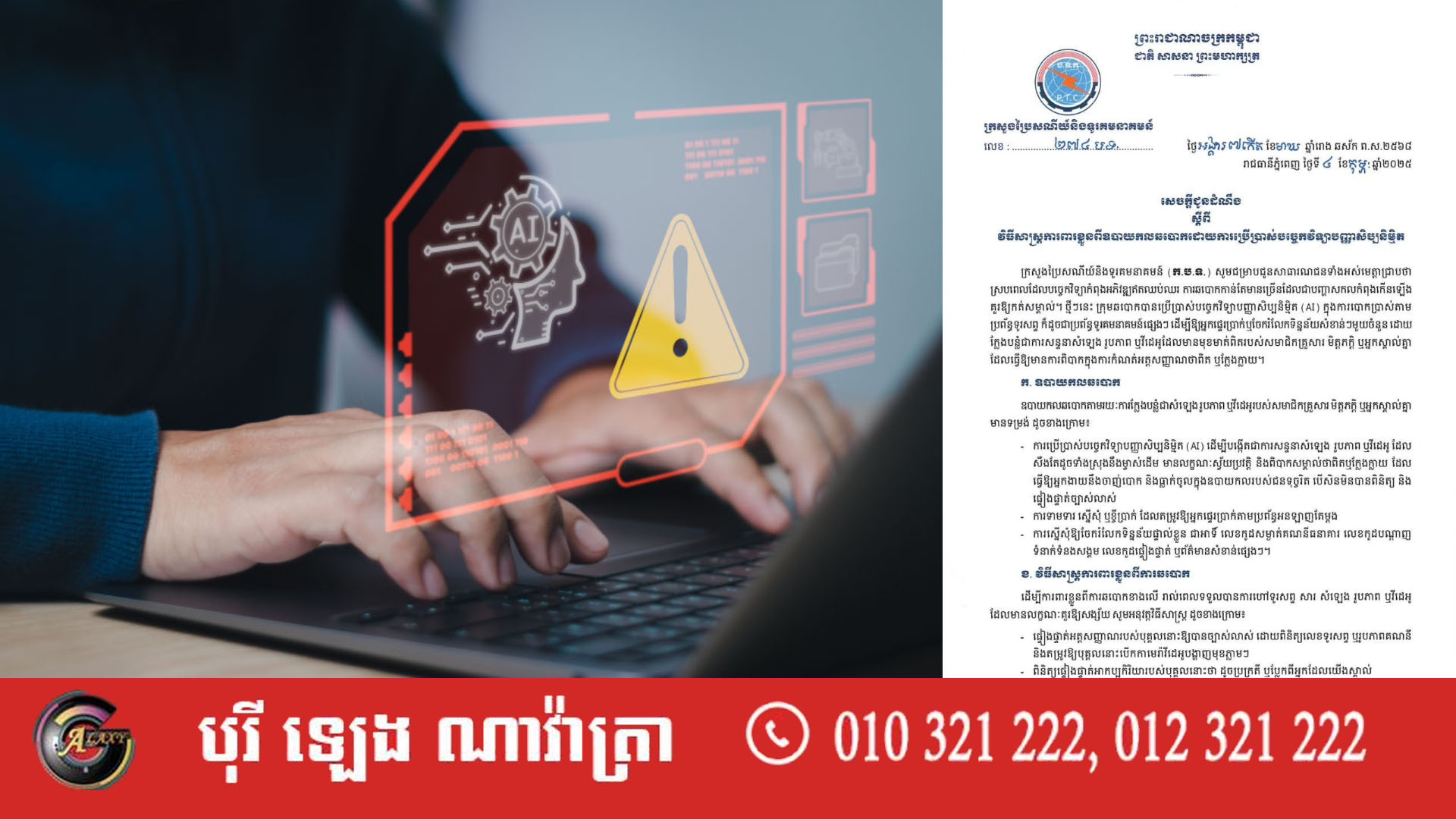 ក្រសួងប្រៃសណីយ៍និងទូរគមនាគមន៍ (ក.ប.ទ.) បានជូនដំណឹងពីវិធីសាស្ត្រការពារខ្លួនពីឧបាយកលឆបោកដោយការប្រើប្រាស់បច្ចេកវិទ្យាបញ្ញាសិប្បនិម្មិត(AI) ក្នុងការបោកប្រាស់ តាមប្រព័ន្ធទូរសព្ទ ក៏ដូចជាប្រព័ន្ធទូរគមនាគមន៍ផ្សេងៗ។