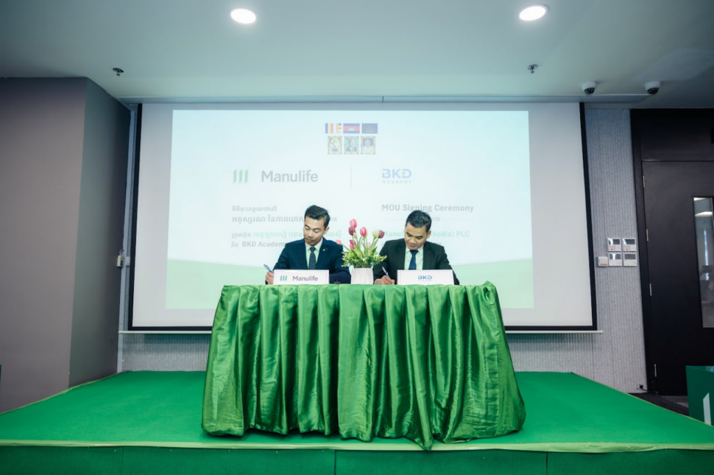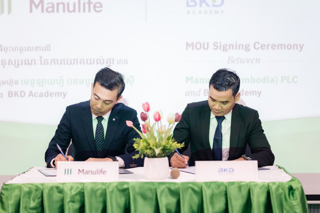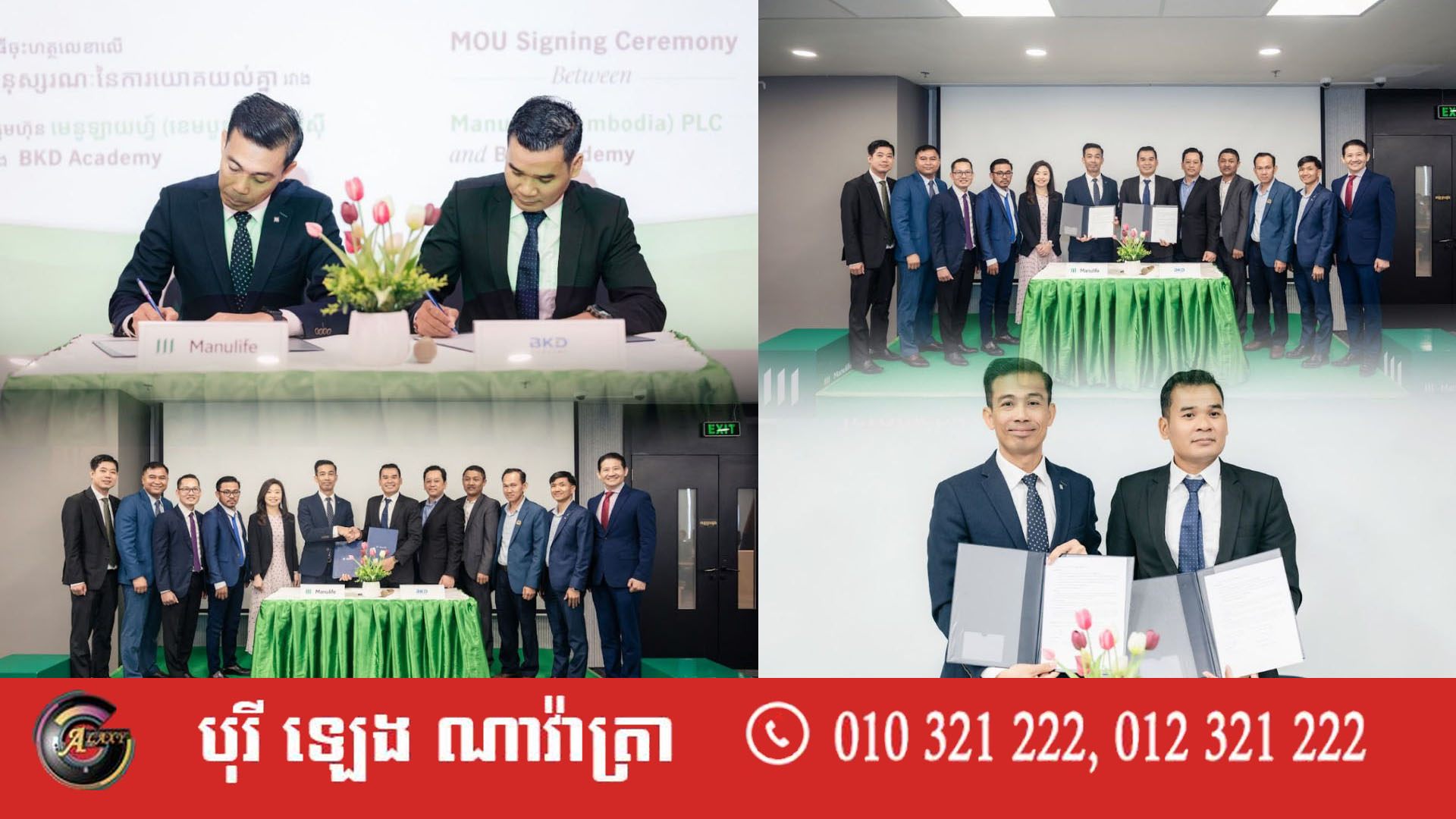 ភ្នំពេញ, កម្ពុជា –នាថ្ងៃទី ០៤ ខែកុម្ភៈ ឆ្នាំ២០២៥ – ក្រុមហ៊ុន BKD Academy និង ក្រុមហ៊ុនធានារ៉ាប់រងអាយុជីវិត Manulife Cambodia បានចុះហត្ថលេខាជាផ្លូវការលើអនុស្សរណៈនៃការយោគយល់គ្នា (MoU) ដោយចាប់ផ្តើមភាពជាដៃគូដ៏មានអត្ថន័យក្នុងការ ជួយលើកកម្ពស់អាជីវកម្មអោយកាន់តែមានភាពប្រសើរឡើង ពាក់ព័ន្ធនឹងជំនាញផ្នែកឌីជីថល និងចំណេះដឹងផ្នែកហិរញ្ញវត្ថុ ដល់អតិថិជន អ្នកសហគ្រិន និងយុវអ្នកដឹកនាំនៅកម្ពុជា។