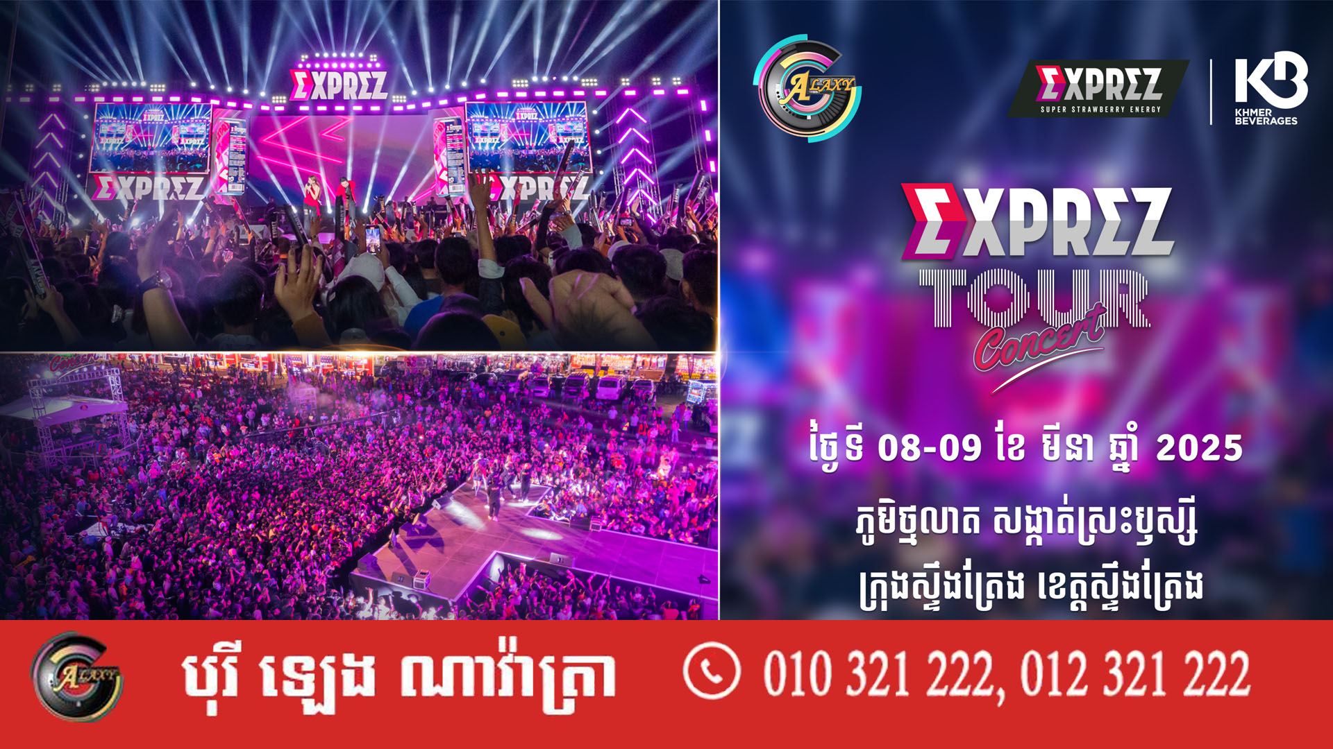 ឥឡូវដល់វេនអ្នកខេត្តស្ទឹងត្រែងហើយ មហាព្រឹត្តិការណ៍ប្រគំតន្រ្តីប្រចាំប្រទេស Exprez Tour Concert របស់ក្រុមហ៊ុនខ្មែរ ប៊ែវើរីជីស សហការជាមួយផលិតកម្ម Galaxy Navatra ដែលនឹងនាំយកកំពូលតារាចម្រៀងប្រចាំប្រទេសជាច្រើនដួង មកអង្រួនឆាក បង្កើតទស្សនីយភាពដ៏អស្ចារ្យ បម្រើអារម្មណ៍ពុកម៉ែបងប្អូន អាចចូលរួមទទួលយកភាពសប្បាយរីករាយ និងរាំលេងកម្សាន្តជាមួយនឹងចង្វាក់ភ្លេងគ្រប់ស្ទាយ៍ ព្រមទាំងបានជួបជាមួយអាយដលជាច្រើនដួងទៀតផង។
