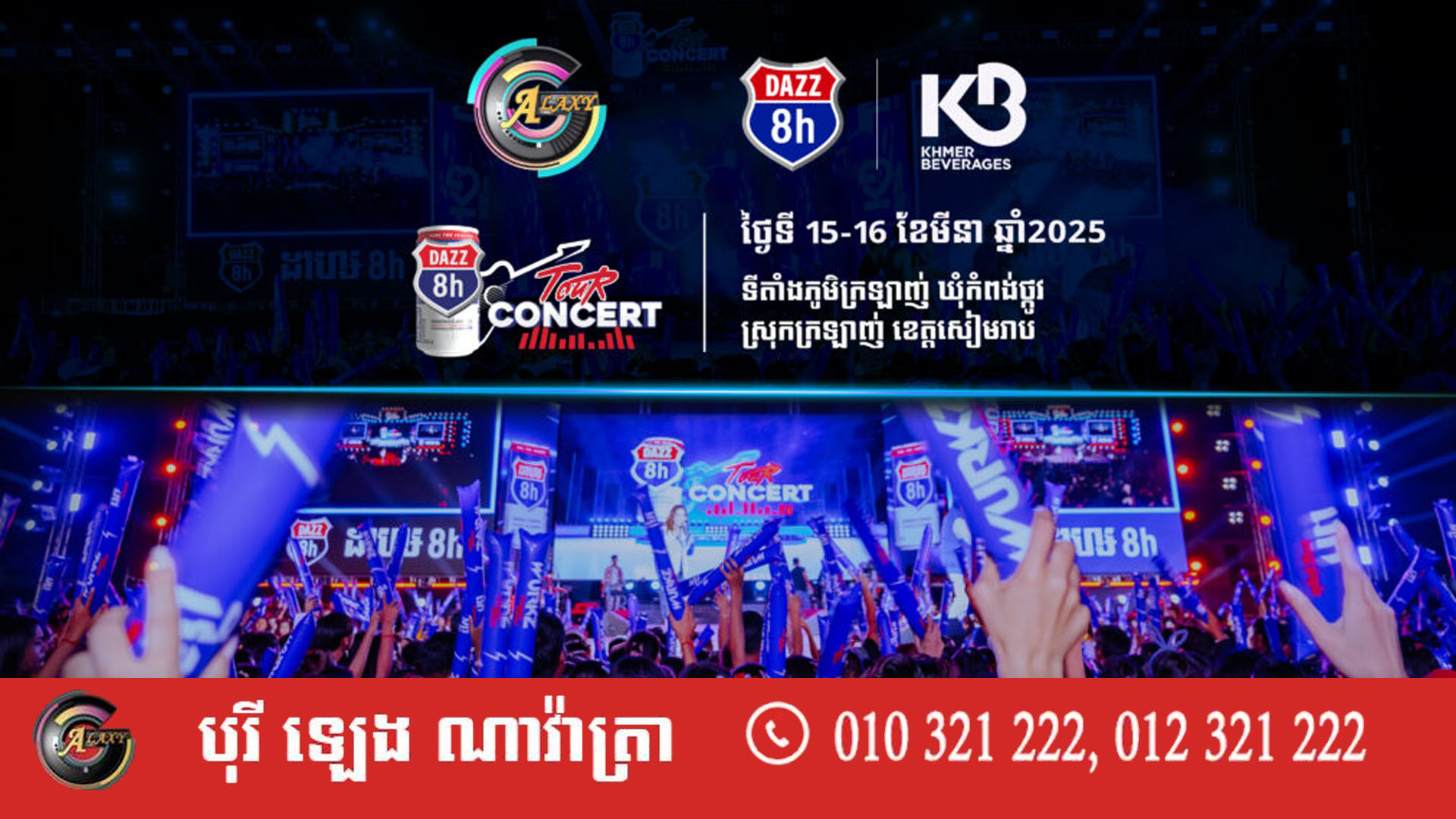 មហាព្រឹត្តិការណ៍ប្រគំតន្រ្តីប្រចាំប្រទេស Dazz Tour Concert របស់ក្រុមហ៊ុនខ្មែរ ប៊ែវើរីជីស សហការជាមួយផលិតកម្ម Galaxy Navatra សប្តាហ៍នេះមានកំពូលតារាចម្រៀង លោក ព្រាប សុវត្ថិ ,លោក ខេម ,លោក ខាន់ ជេមស៌ រួមជាមួយ លោក គូម៉ា ,លោក Tempo Tris ,លោក សុវត្ថិ មុនីវណ្ណ ,លោក សុវត្ថិ សិរីវុឌ្ឍ ,អ្នកនាង ខាត់ សួស្តី ,កញ្ញា L-D-A ,កញ្ញា ធីតា ដាវីកា ,លោក ពូ និងកញ្ញា Na Bee ព្រមទាំងកំពូលតារាចម្រៀង ឧកញ៉ា ខេមរៈ សិរីមន្ត ក៏អញ្ជើញចូលរួមផងដែរ ដែលនឹងមកអង្រួញឆាកតន្រ្តី DAZZ Tour Concert ឱ្យកក្រើក រញ្ជួយដីតែម្តង ។