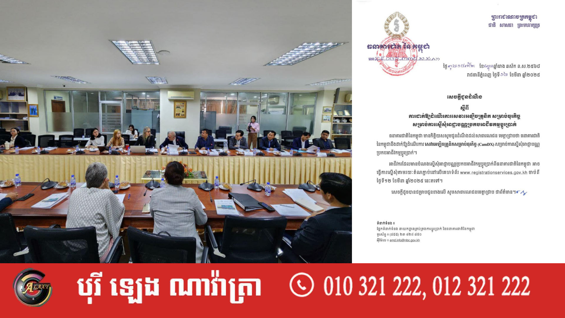 អាជីវករដែលមានបំណងស្នើសុំអាជ្ញាបណ្ណប្រកបអាជីវកម្មប្តូរប្រាក់ពីធនាគារជាតិនៃកម្ពុជា អាច ធ្វើការស្នើសុំតាមរយៈតំណភ្ជាប់នៅលើគេហទំព័រ www.registrationservices.gov.kh ចាប់ពី ថ្ងៃទី១២ ខែ មីនា ឆ្នាំ២០២៥ នេះតទៅ។