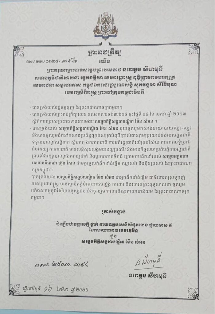 ព្រះមហាក្សត្រ ចេញព្រះរាជក្រឹត្យ ដំឡើងឋានន្តរស័ក្តិ ថ្នាក់ «នាយឧត្តមសេនីយ៍ផុតលេខ ផ្កាយមាស៥» សម្តេចកិត្តិសង្គហបណ្ឌិត ម៉ែន សំអន
