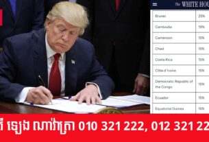 លោក ដូណាល់ត្រាំ (Donald J. Trump) សម្រេព្យួរការអនុវត្តពន្ធគយបដិការរបស់ខ្លួន មកត្រឹមអត្រា ១០% ក្នុងរយៈពេល ៩០ថ្ងៃ សម្រាប់គ្រប់ប្រទេសទាំងអស់ ដែលបានស្នើសុំចរចាស្វែងរកដំណោះស្រាយ ជាមួយសហរដ្ឋអាម៉េរិក ក្នុងនោះ រួមមាន កម្ពុជា ផងដែរ។