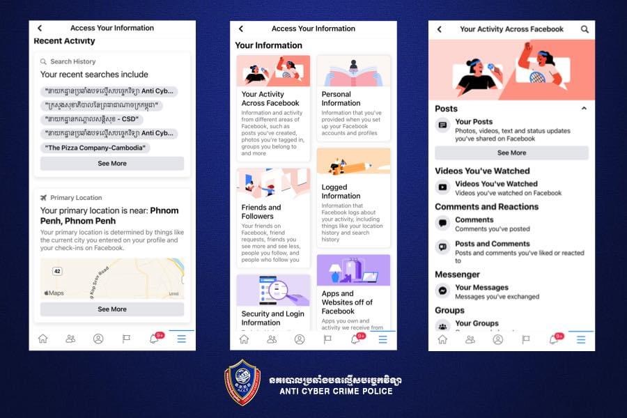 លោកអ្នកអាចប្រើមុខងារនេះ ដោយចូលទៅក្នុងផ្នែក Settings & Privacy -> Settings -> “Access Your Information”៕ ប្រភព៖ នាយកដ្ឋានប្រយុទ្ធប្រឆាំងបទល្មើសបច្ចេកវិទ្យាល